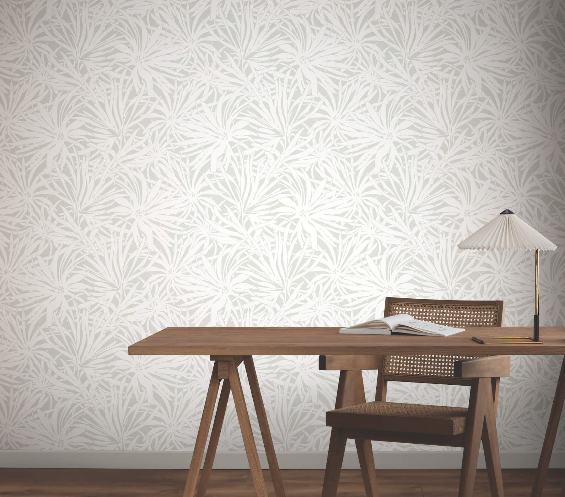 Spindly flowers create an inviting tangle of silhouettes in design Floral Canopy. Seen here in white against pale grey. This Floral Canopy Wallpaper measures approximately 27 inches wide by 27 feet long, measuring approximately 60.8 square feet per roll. The song of the forest echoes within the rich, earthen textures and greenery of this nature-inspired collection.