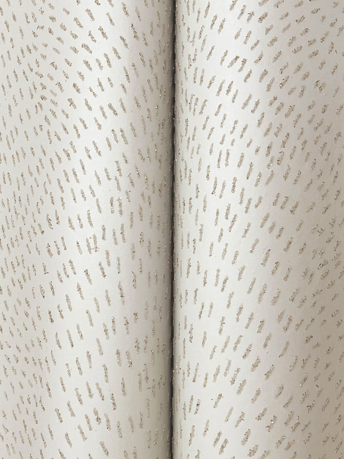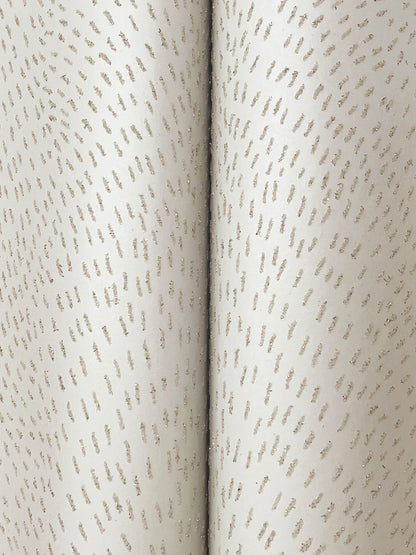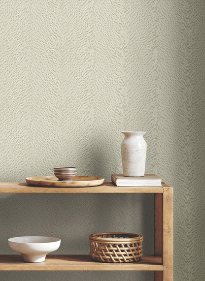 Dew Drop's glistening, sand and glitter-embellished dashes capture the ethereal beauty of gossamer webs beautified by the rain. Featured here in silver glitter against warm beige. This Dew Drop Wallpaper measures approximately 27 inches wide by 27 feet long, measuring approximately 60.8 square feet per roll. The song of the forest echoes within the rich, earthen textures and greenery of this nature-inspired collection.
