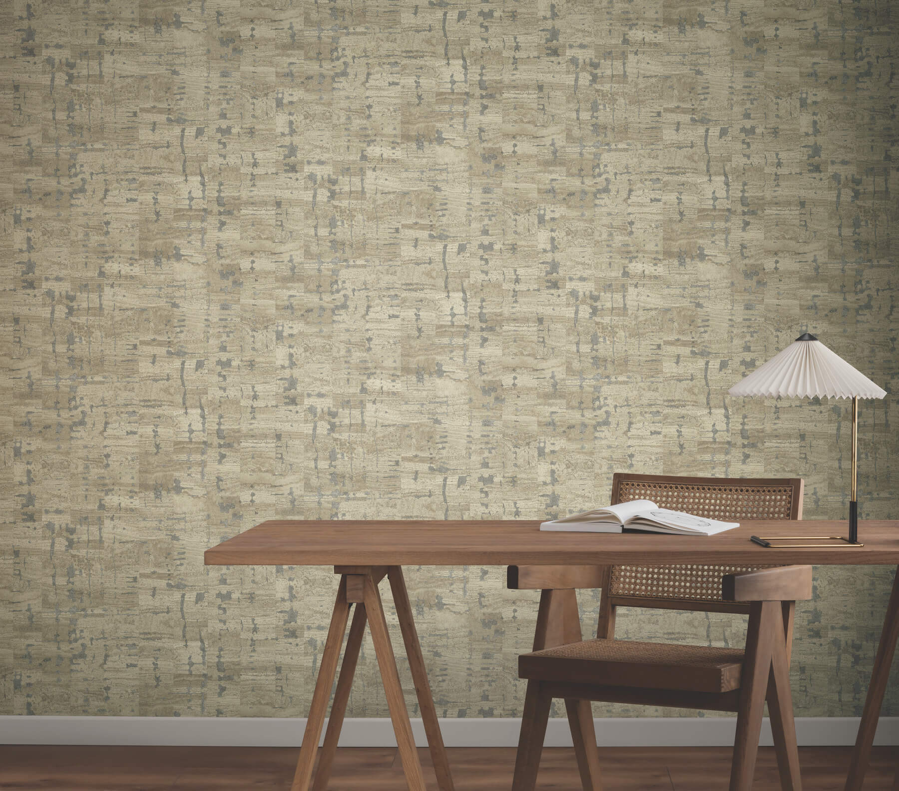 Pop The Cork perfectly captures the organic elegance of cork, its rich dimension replicated on a slightly larger scale. Featured here in taupe, brown, and charcoal with pearlescent accents. This Pop The Cork Wallpaper measures approximately 27 inches wide by 27 feet long, measuring approximately 60.8 square feet per roll. The song of the forest echoes within the rich, earthen textures and greenery of this nature-inspired collection.