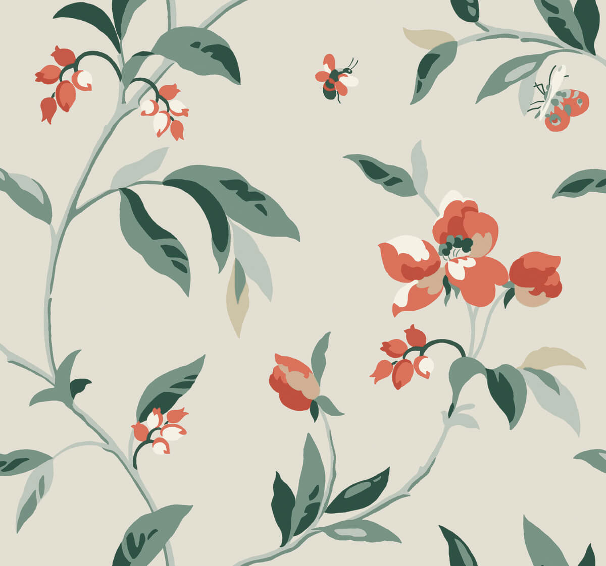 Bees and butterflies announce the season as they dance between the blossoms of the pattern Springtime.