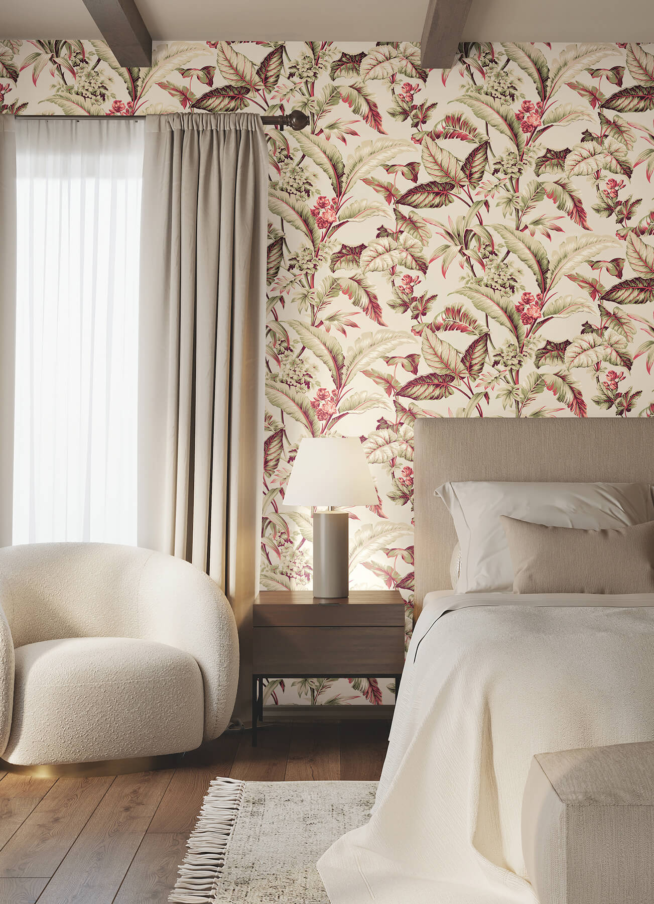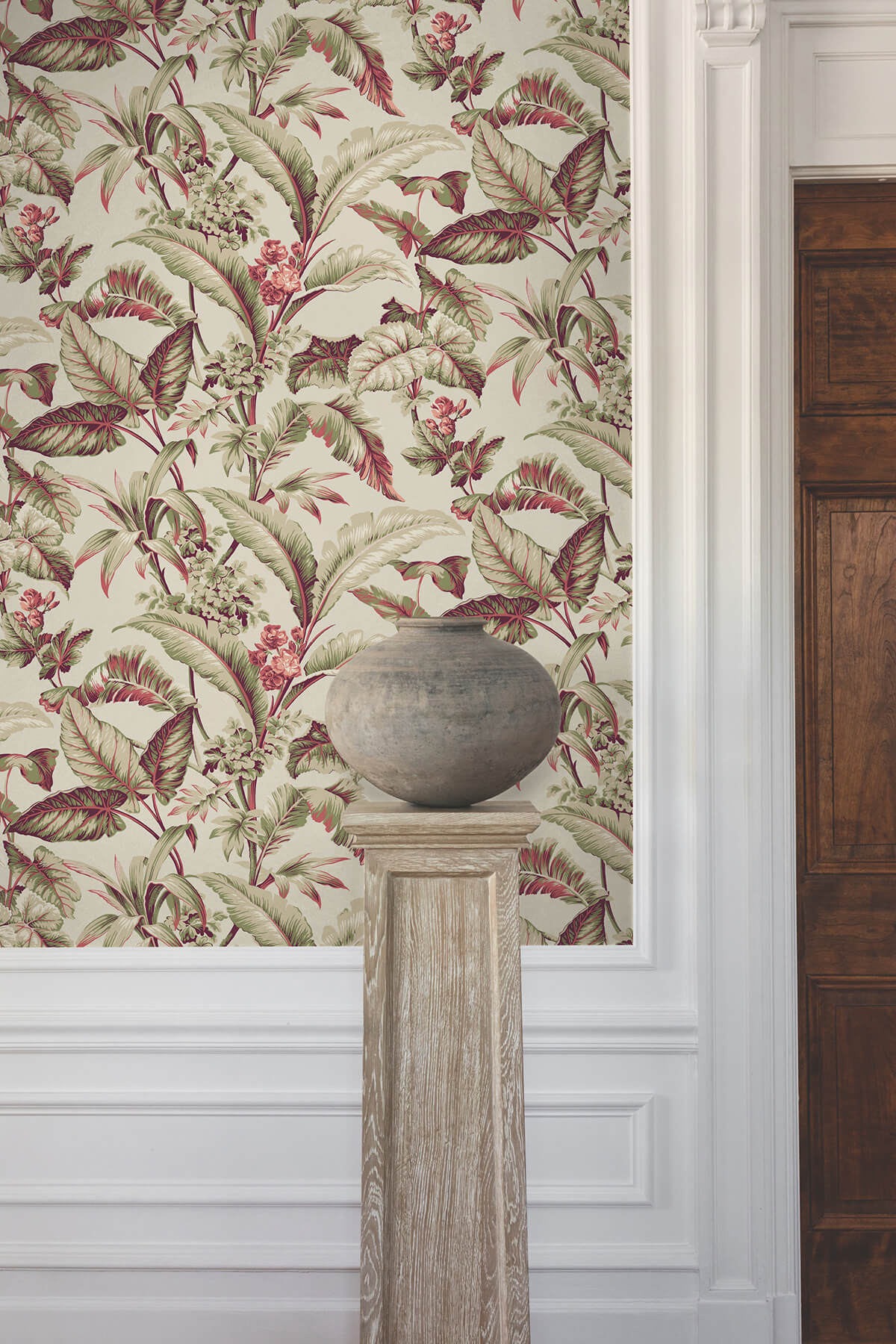 The tropical fronds, flowers, and foliage of Mystic Isle inspire images of international travel and a luxury lifestyle shown in neutral beige and pink on taupe brown. This Mystic Isle Wallpaper measures approximately 27 inches wide by 27 feet long, measuring approximately 60.8 square feet per roll. The distinction of timeless style. The distinction of timeless style.