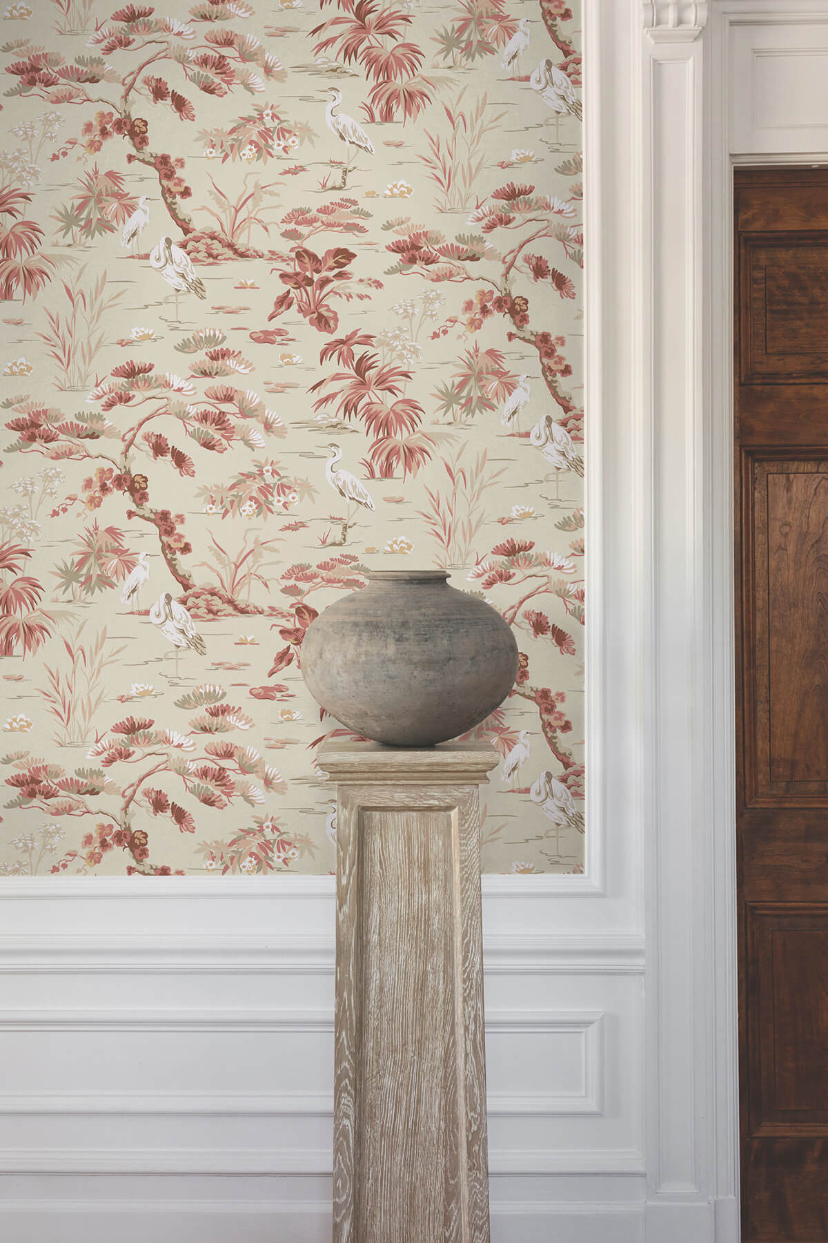 Herons and cranes rest between the lotus blossoms and Matsu trees in Bridgewater's stylized rendering of Asian wetlands, shown here in coral pink with blush and neutrals. This Bridgewater Wallpaper measures approximately 27 inches wide by 27 feet long, measuring approximately 60.8 square feet per roll. The distinction of timeless style.