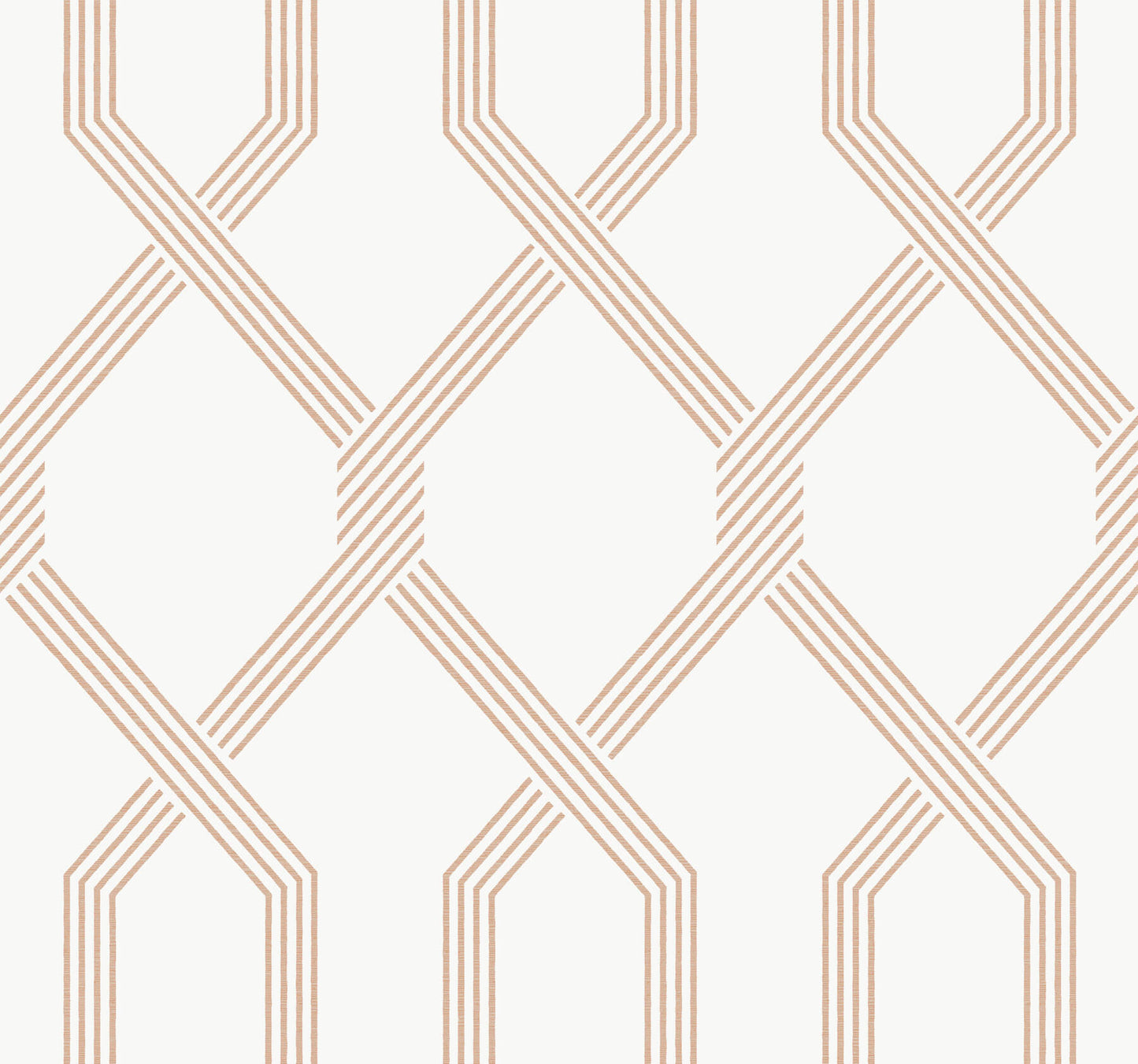 Oversized diamonds within Palisade form as the geometric crossing of lines twist into a ribbon of angled stripes, shown in soft coral orange on white. This Palisade Wallpaper measures approximately 27 inches wide by 27 feet long, measuring approximately 60.8 square feet per roll. The distinction of timeless style.