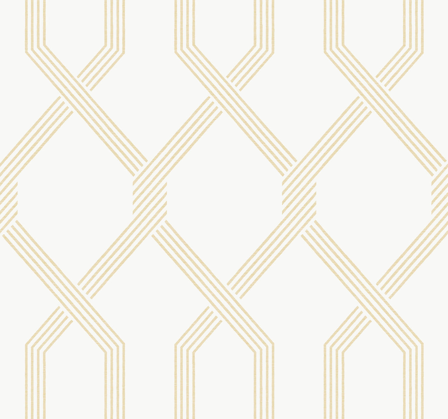 Oversized diamonds within Palisade form as the geometric crossing of lines twist into a ribbon of angled stripes, shown in flaxen yellow on white. This Palisade Wallpaper measures approximately 27 inches wide by 27 feet long, measuring approximately 60.8 square feet per roll. The distinction of timeless style.