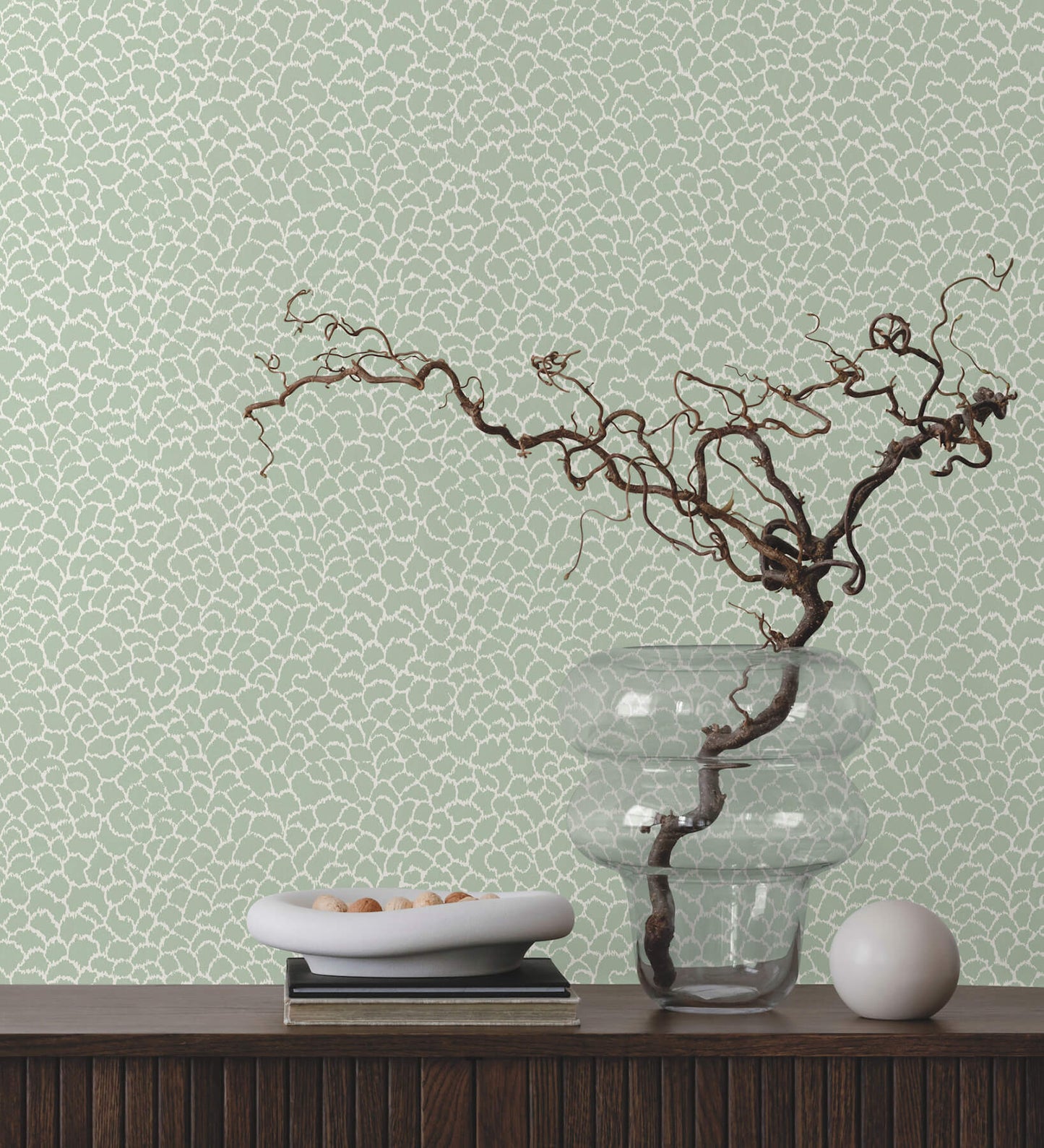 The wildlife and underbrush of the African savanna inspire Nadie’s organic textural abstract pattern, shown here in celadon green with white. This Nadie Wallpaper measures approximately 27 inches wide by 27 feet long, measuring approximately 60.8 square feet per roll. The distinction of timeless style.