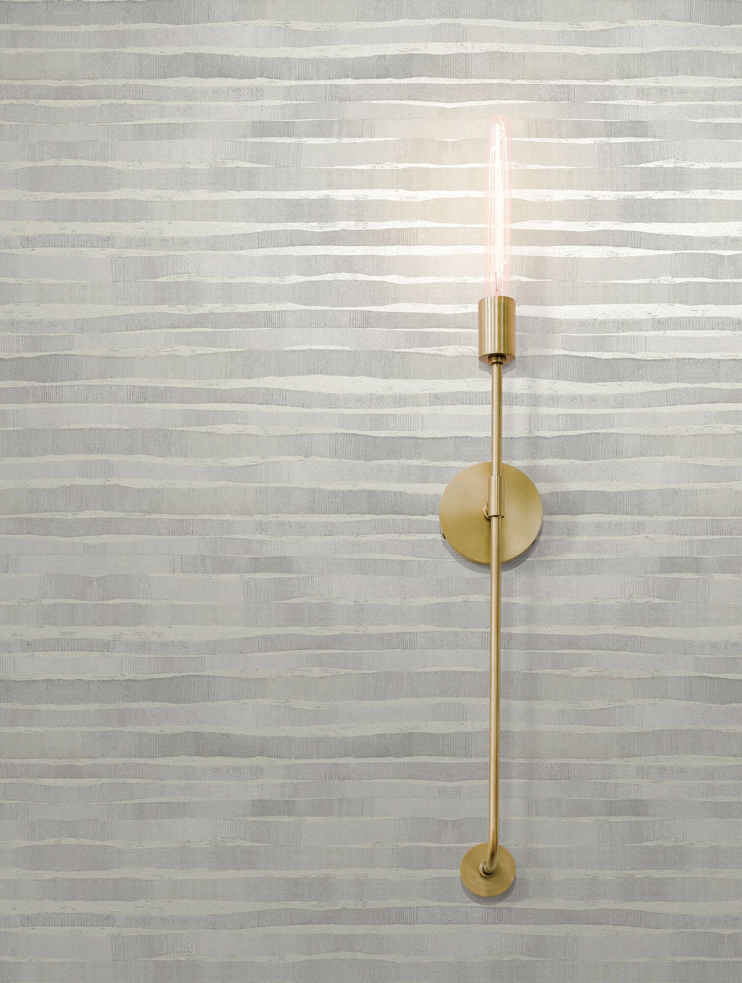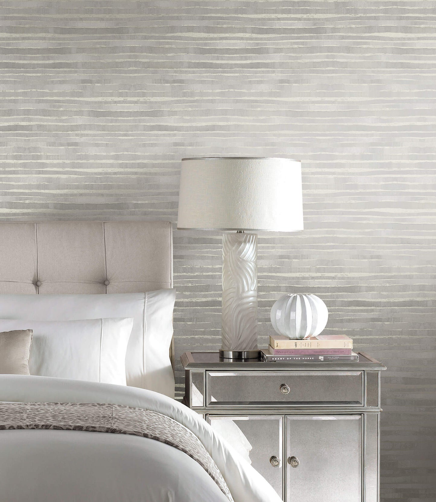 The wallpaper pattern Dreamscapes horizontal stripes of color and metallic create the feeling of a handcrafted mixed media art installation. The Ronald Redding 24 Karat collection exemplifies this blend of quiet sophistication and fine quality with the glamour of modern urban living.