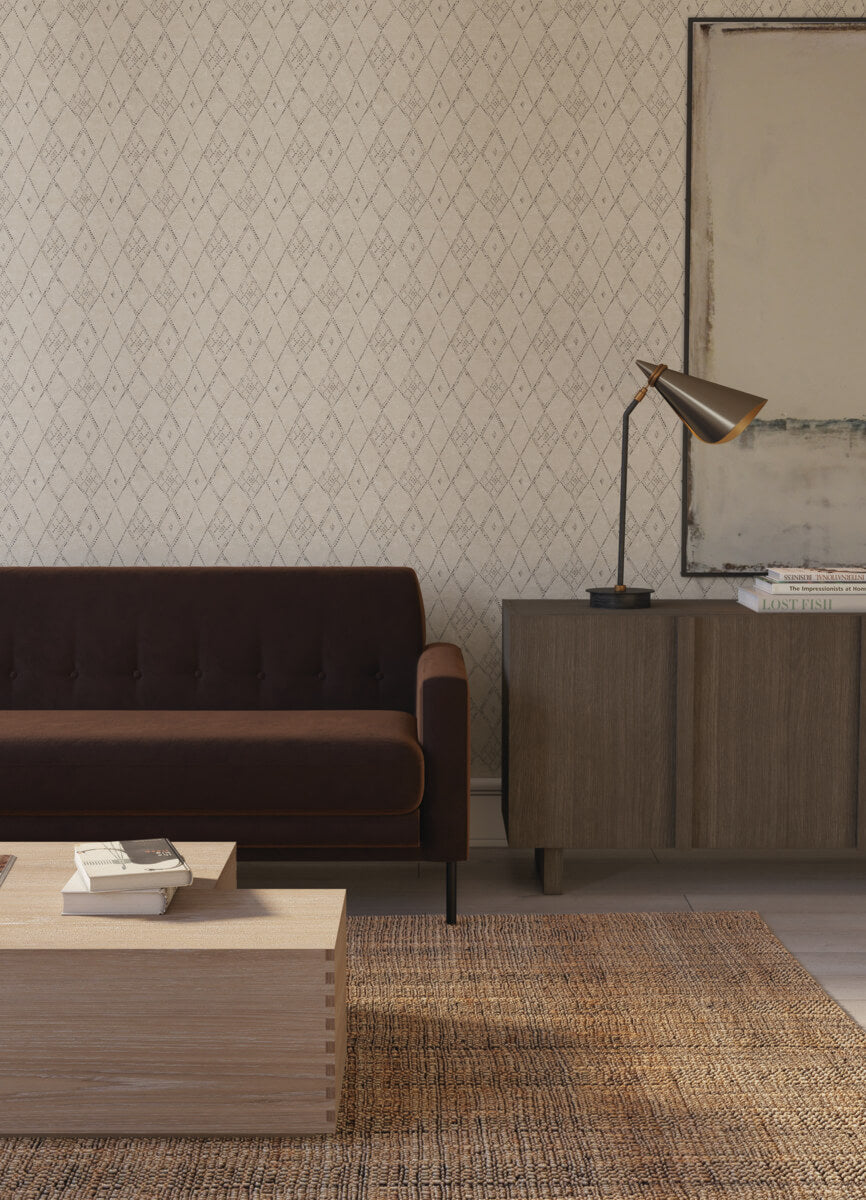 The natural dye and handpainted style of Souk Diamonds depicts the beautiful loomed woven of organic linens found in tribal open-air markets, shown in taupe brown with charcoal grey. This Souk Diamonds Wallpaper measures approximately 27 inches wide by 27 feet long, measuring approximately 60.8 square feet per roll. A retrospective from the private collections of Christiane Lemieux featuring global, artistic and handcrafted designs. Lemieux et Cie is luxury in perfect minimalism, edited to be richly layered yet effortlessly relaxed. This is deeply personal style built on an obsessive dedication to quality, craftsmanship, and the perfection found in the imperfect. A retrospective from the private collections of Christiane Lemieux featuring global, artistic, and handcrafted designs.