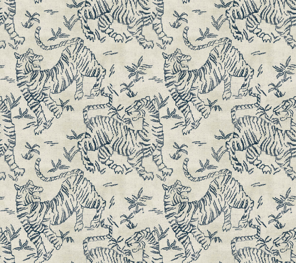 The heirloom prayer rugs of Tibetan monasteries inspired European tapestries such as the stylized rendering of Orly Tigers, shown in indigo blue on ecru. This Orly Tigers Wallpaper measures approximately 27 inches wide by 27 feet long, measuring approximately 60.8 square feet per roll. A retrospective from the private collections of Christiane Lemieux featuring global, artistic, and handcrafted designs. Lemieux et Cie is luxury in perfect minimalism, edited to be richly layered yet effortlessly relaxed. This is deeply personal style built on an obsessive dedication to quality, craftsmanship, and the perfection found in the imperfect. A retrospective from the private collections of Christiane Lemieux featuring global, artistic, and handcrafted designs.