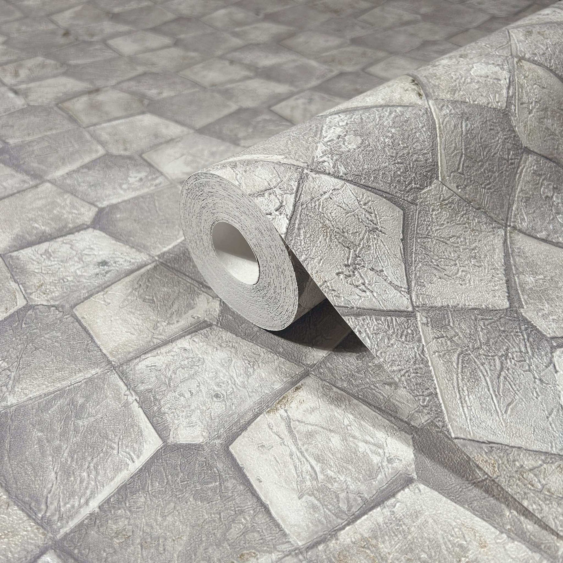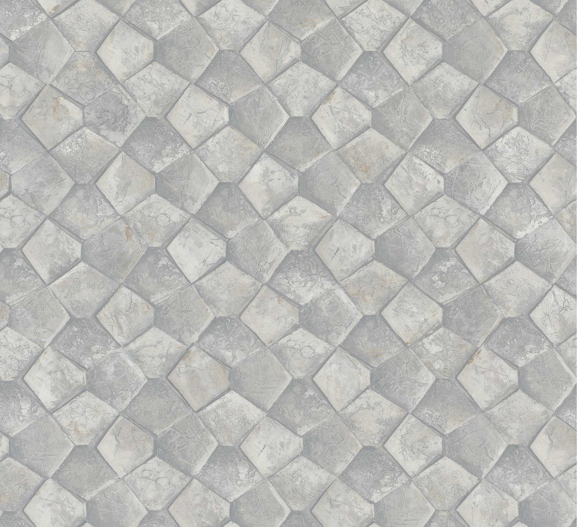 Pattern Waterford's irregular, textured tiles mimic the look of stone. Featured here in gradients of grey and beige. Waterford is an unpasted, vinyl wallpaper measuring 27.6 inches wide by 33 feet long, covering approximately About 75.9 square feet square feet per roll. The Antonina Vella Opulent Accents collection features luxury embossed vinyl wallpaper with rich texture and modern elegance. Designed by Antonina Vella for York Wallcoverings, these non-woven wallpapers add depth, durability, and sophisticated style to both residential and commercial spaces.