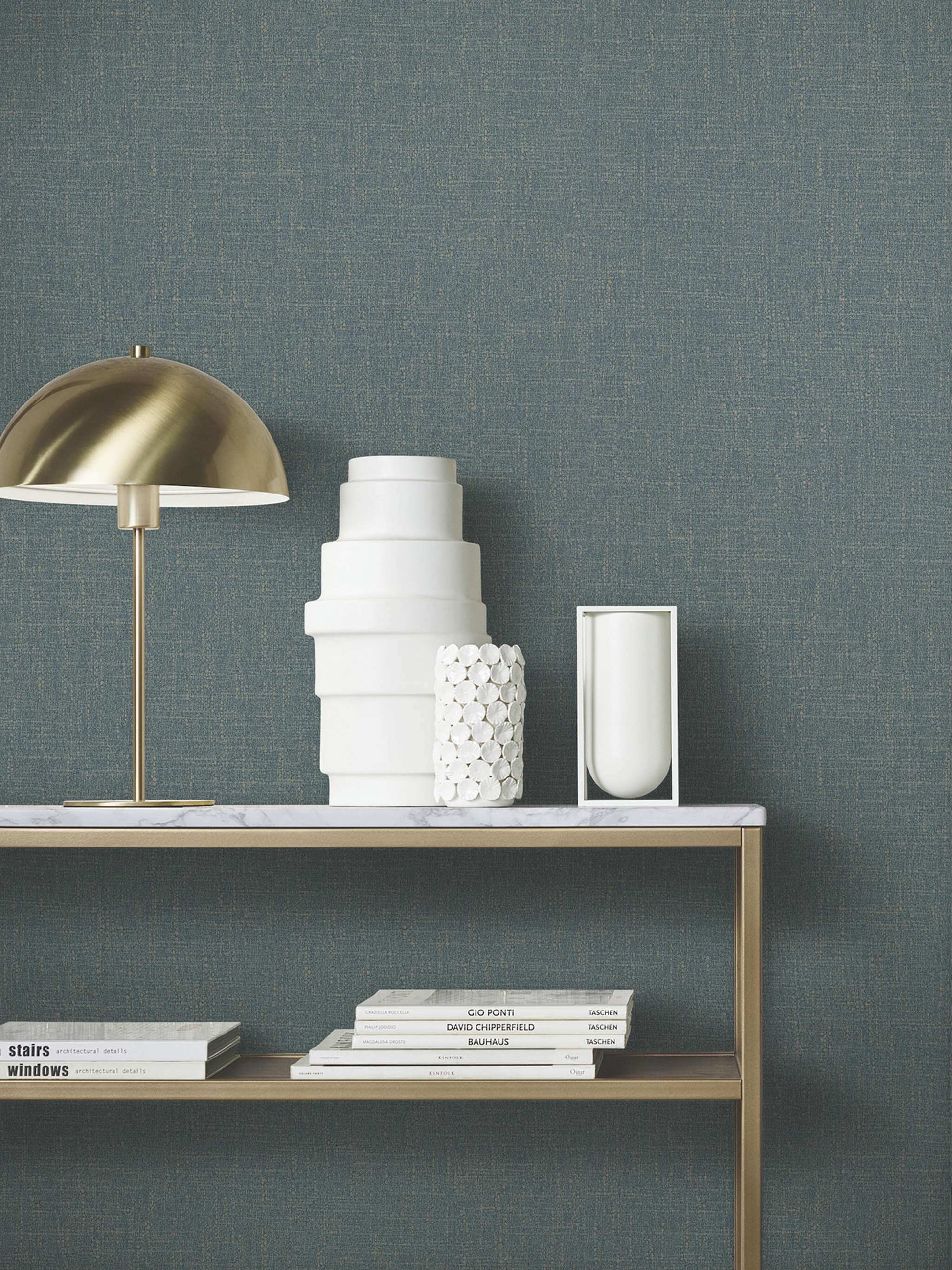 Pattern Highland Tweed captures the sophisticated look of the iconic fabric. Featured here in deep blue laced with muted gold. Highland Tweed is an unpasted, vinyl wallpaper measuring 27.6 inches wide by 33 feet long, covering approximately About 75.9 square feet square feet per roll. The Antonina Vella Opulent Accents collection features luxury embossed vinyl wallpaper with rich texture and modern elegance. Designed by Antonina Vella for York Wallcoverings, these non-woven wallpapers add depth, durability, and sophisticated style to both residential and commercial spaces.