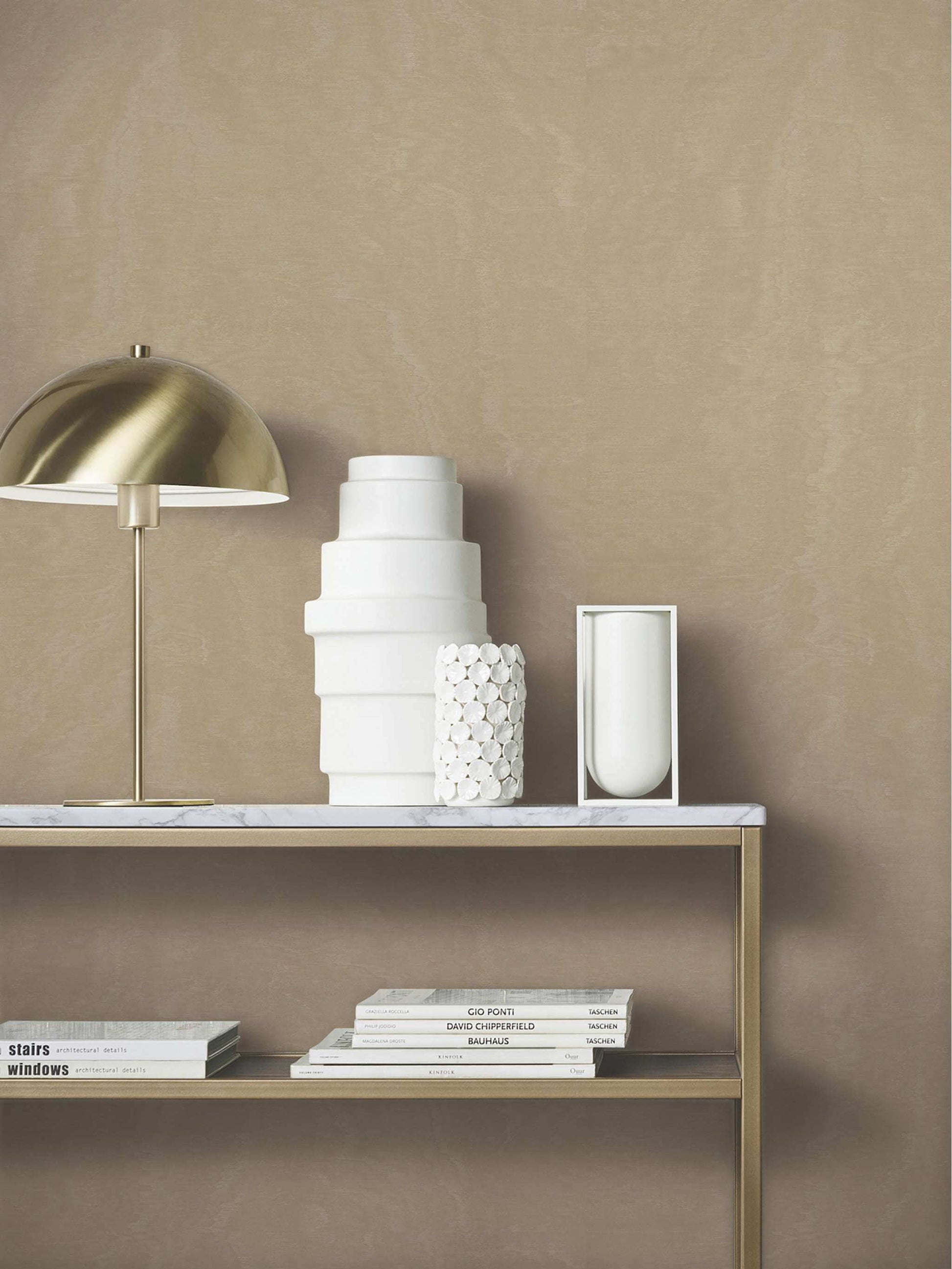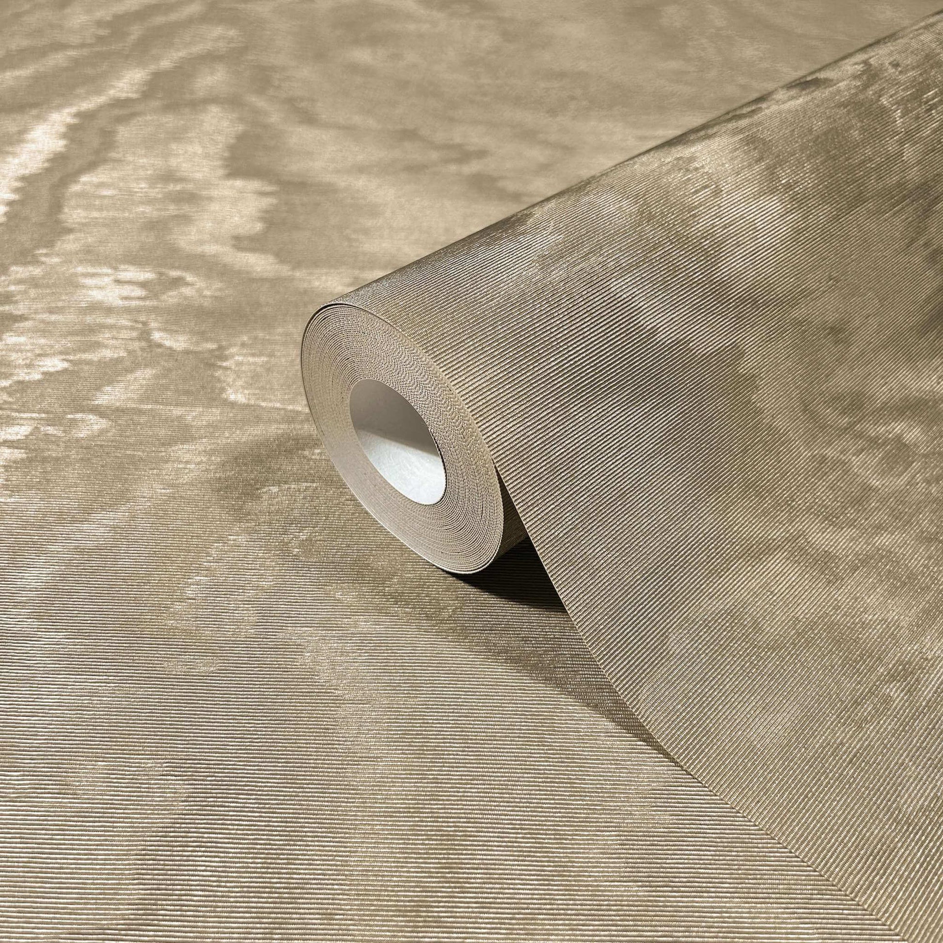 A pearlescent finish to the elegant ripples of Shimmering Moire invite depth and movement to interiors. Seen here in warm taupe. Shimmering Moire is an unpasted, vinyl wallpaper measuring 27.6 inches wide by 33 feet long, covering approximately About 75.9 square feet square feet per roll. The Antonina Vella Opulent Accents collection features luxury embossed vinyl wallpaper with rich texture and modern elegance. Designed by Antonina Vella for York Wallcoverings, these non-woven wallpapers add depth, durability, and sophisticated style to both residential and commercial spaces.