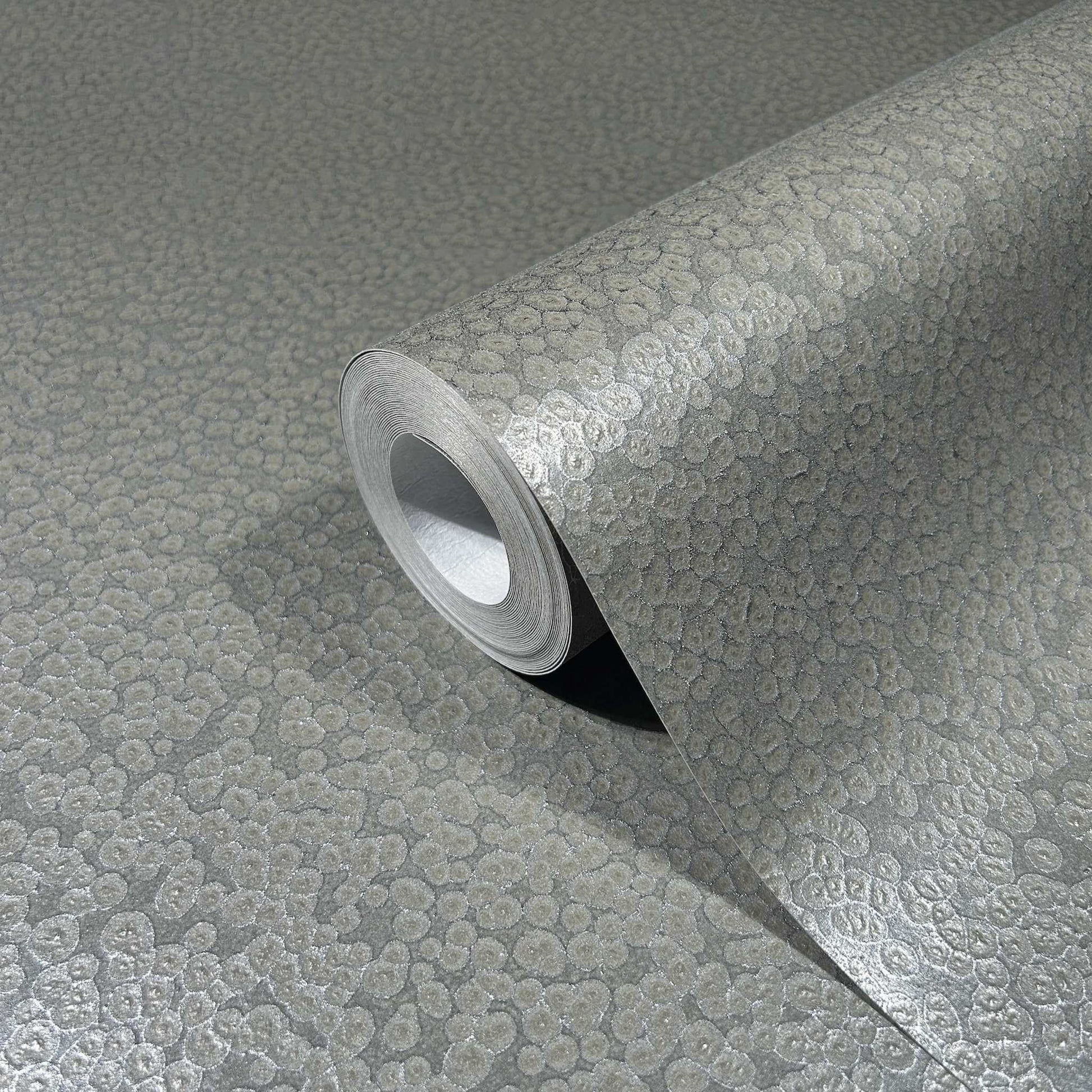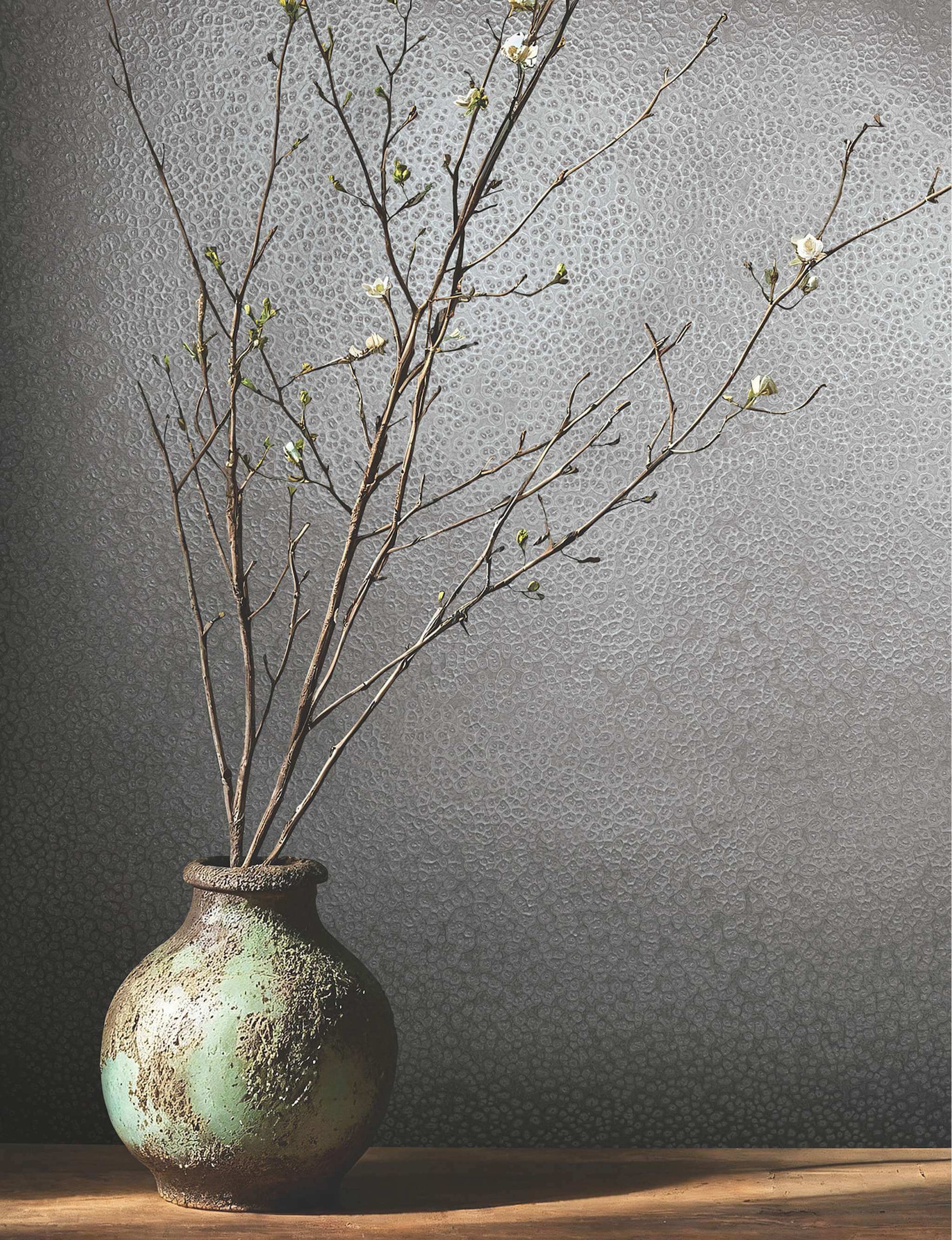 Pattern Hudson replicates the delicate precision and powerful hand needed to create hammered metal accents. Featured here in pewter accented by silver. Hudson is an unpasted, vinyl wallpaper measuring 27.6 inches wide by 33 feet long, covering approximately About 75.9 square feet square feet per roll. The Antonina Vella Opulent Accents collection features luxury embossed vinyl wallpaper with rich texture and modern elegance. Designed by Antonina Vella for York Wallcoverings, these non-woven wallpapers add depth, durability, and sophisticated style to both residential and commercial spaces.