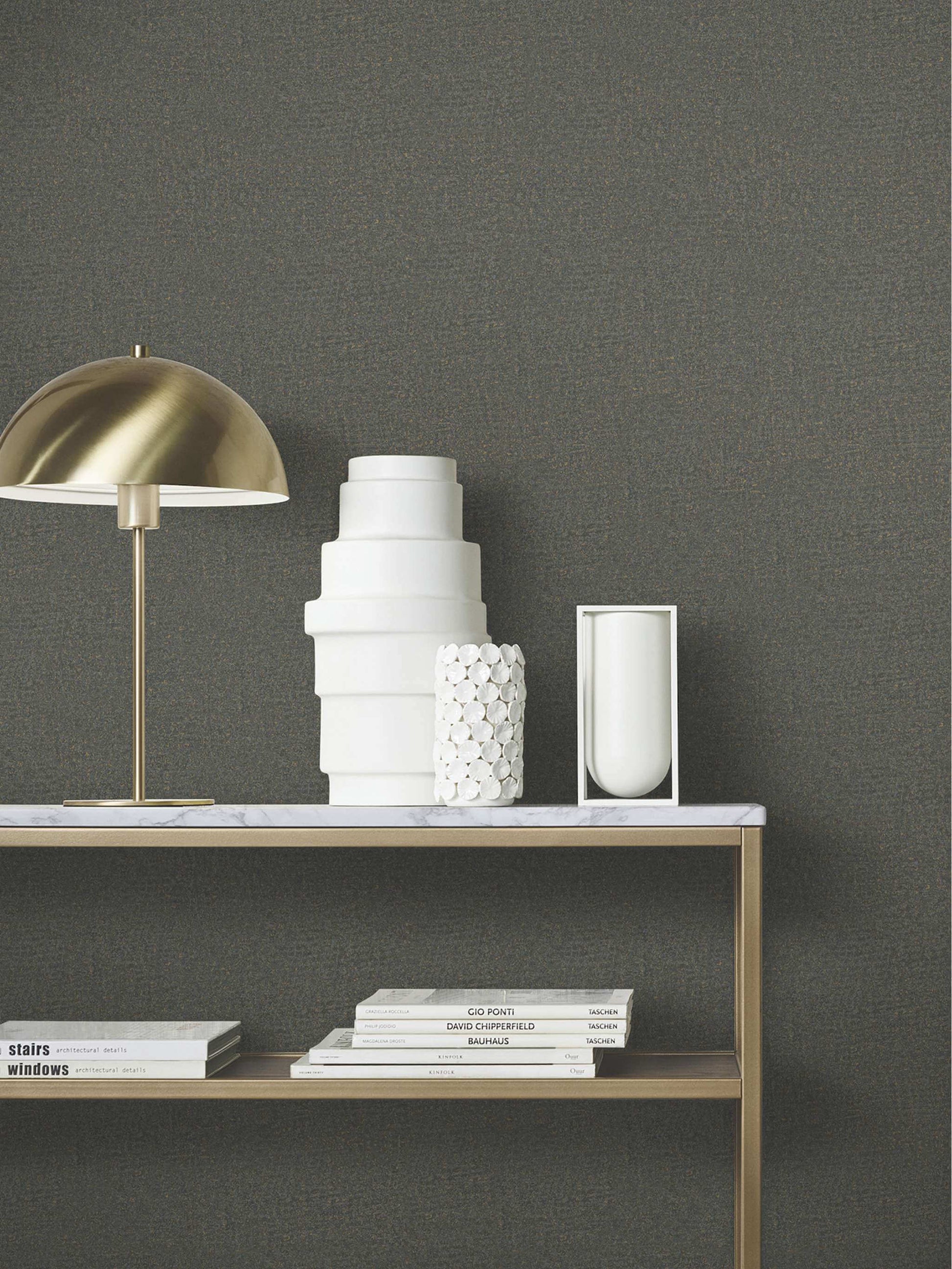 Garden Stone's delicate texture is reminiscent of pebbled walkways. Seen here in rich charcoal brushed with antique gold. Garden Stone is an unpasted, vinyl wallpaper measuring 20.9 inches wide by 33 feet long, covering approximately About 57.5 square feet square feet per roll. The Antonina Vella Opulent Accents collection features luxury embossed vinyl wallpaper with rich texture and modern elegance. Designed by Antonina Vella for York Wallcoverings, these non-woven wallpapers add depth, durability, and sophisticated style to both residential and commercial spaces.