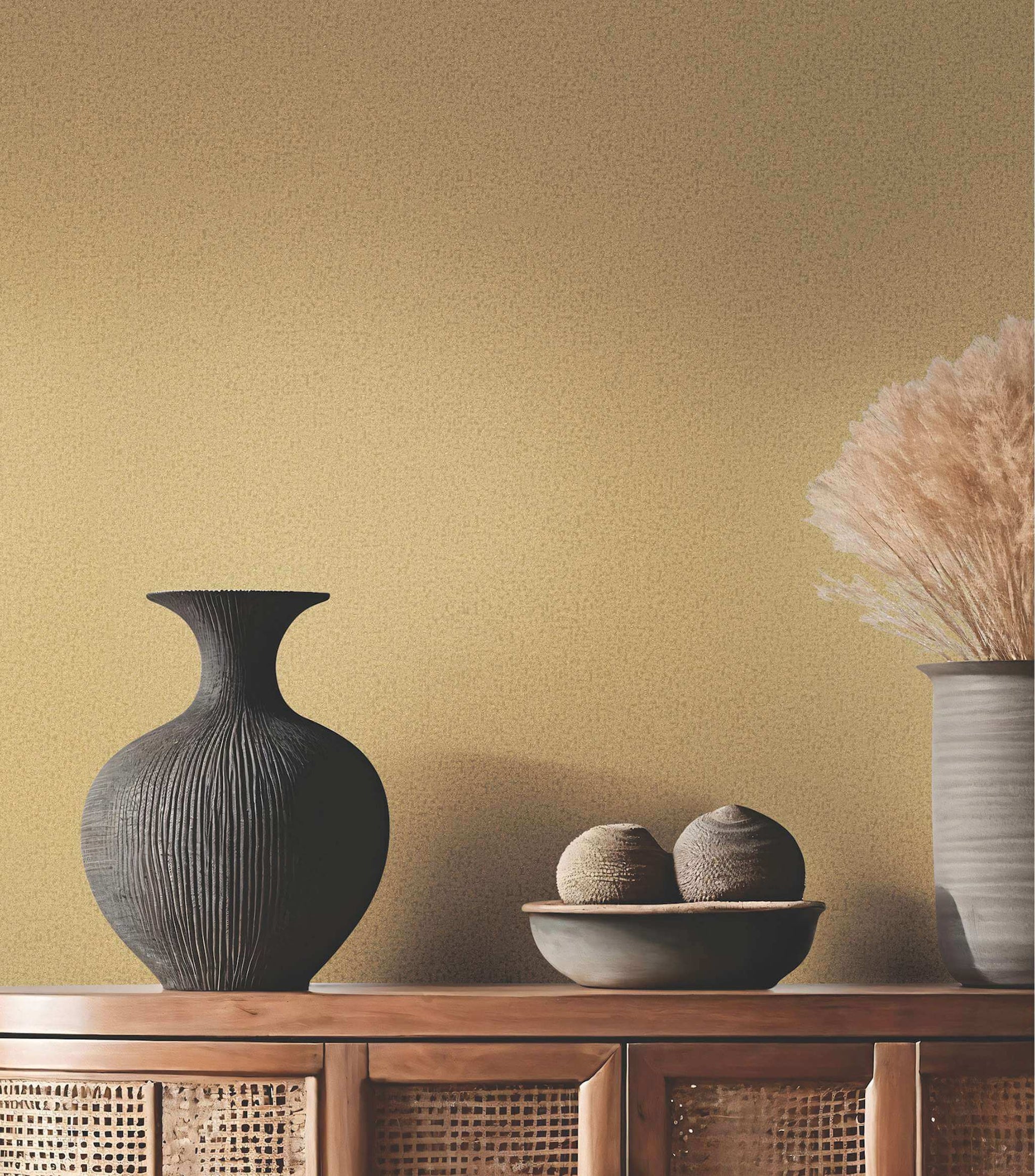 Monotone color is subtly enhanced with a rough, pebble-like texture in pattern Eastwind. Seen here in metallic gold. Eastwind is an unpasted, vinyl wallpaper measuring 27.6 inches wide by 33 feet long, covering approximately About 75.9 square feet square feet per roll. The Antonina Vella Opulent Accents collection features luxury embossed vinyl wallpaper with rich texture and modern elegance. Designed by Antonina Vella for York Wallcoverings, these non-woven wallpapers add depth, durability, and sophisticated style to both residential and commercial spaces.