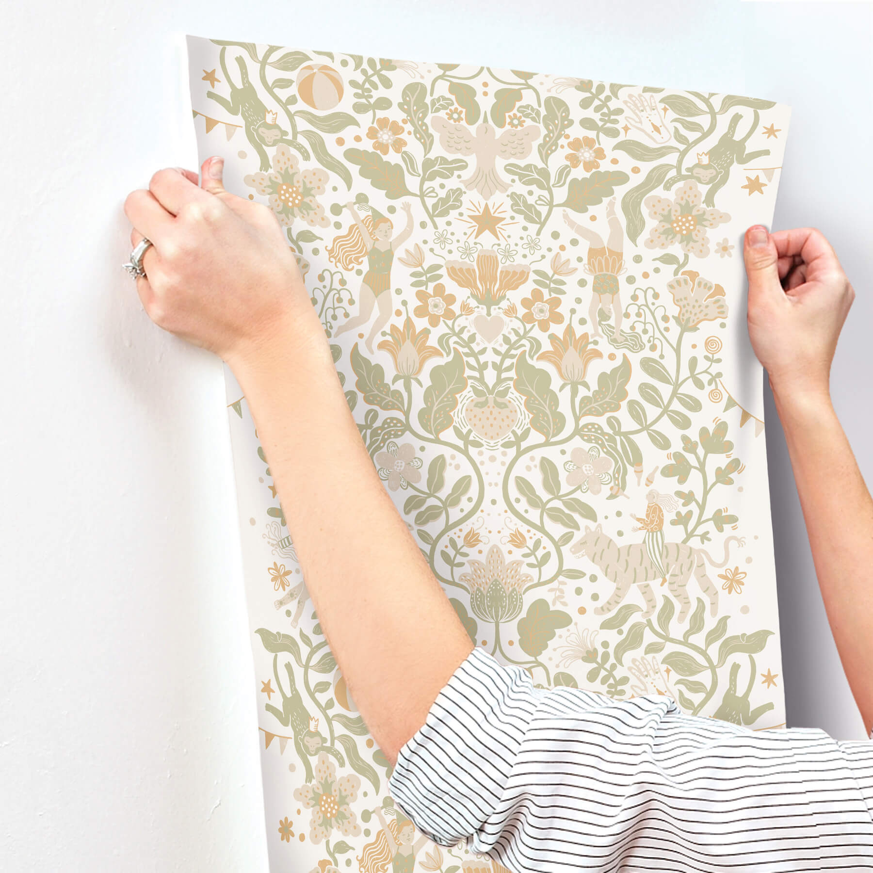 This illustrative stripe revels in the marvels of the circus. Acrobats, jugglers, and other joyful performers and their animal companions make an appearance throughout the twining floral vines. Pictured here in a palette of mossy green, tangerine, beige, and white. This Cirkus Wallpaper measures approximately 20.9 inches wide by 33 feet long, measuring approximately 57.5 square feet per roll. Embark on a journey bursting with child-like wonder with Lina Schnaufer's collection, Daydream. The trip around the world features explorations on hot air balloons, train rides through the mountains, trips to the circus, and other whimsical adventures.