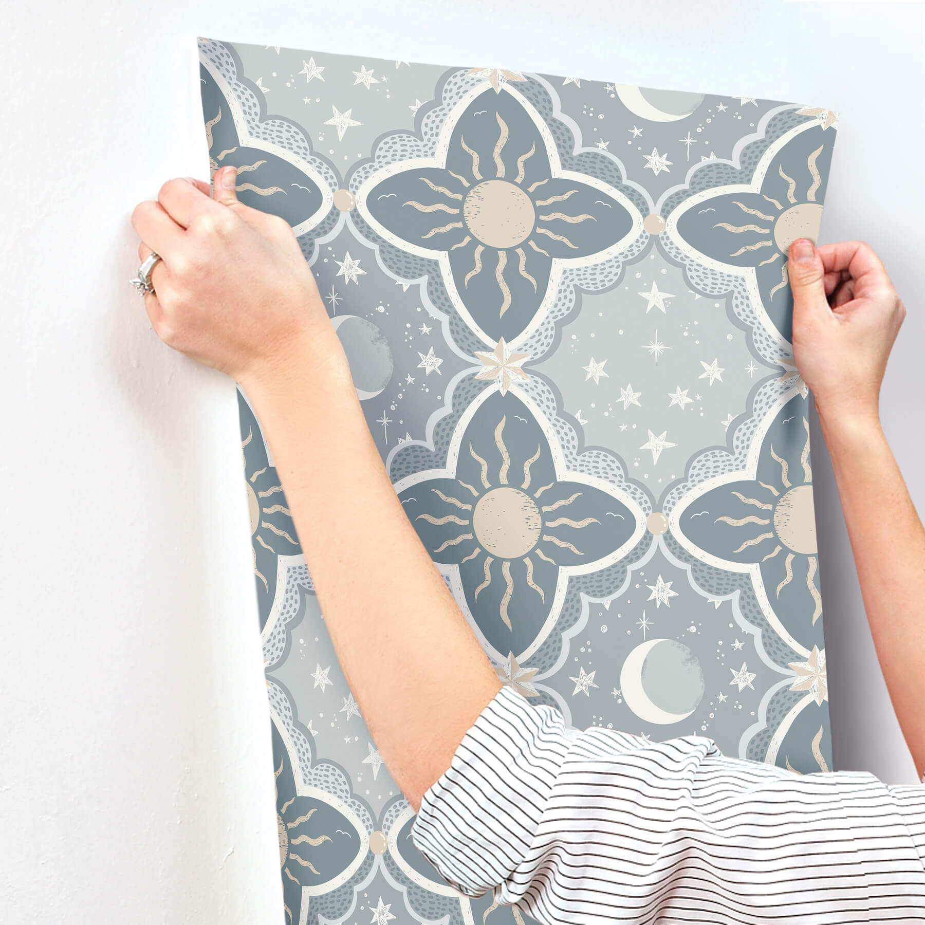 This celestial quatrefoil celebrates the beauty of the skies, more particularly the sun, moon, and stars that shine day and night. Featured here in shades of blue, white, and taupe. This Sol & Mane Wallpaper measures approximately 20.9 inches wide by 33 feet long, measuring approximately 57.5 square feet per roll. Embark on a journey bursting with child-like wonder with Lina Schnaufer's collection, Daydream. The trip around the world features explorations on hot air balloons, train rides through the mountains, trips to the circus, and other whimsical adventures.