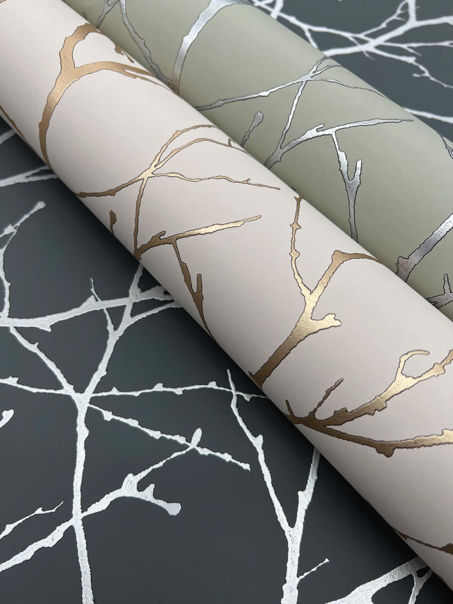 The bare branches and twigs of pattern Trees Silhouette captivate and glow with modern metallic, enhancing their inherent natural beauty, shown in tan beige with gold metallic. This Trees Silhouette Wallpaper measures approximately 20.8 inches wide by 33 feet long, measuring approximately 57.2 square feet per roll. The long awaited follow-up to the popular first release, Modern Metals Second Edition energizes contemporary spaces with charismatic visual artistry defined by the allure of luminous metallic.