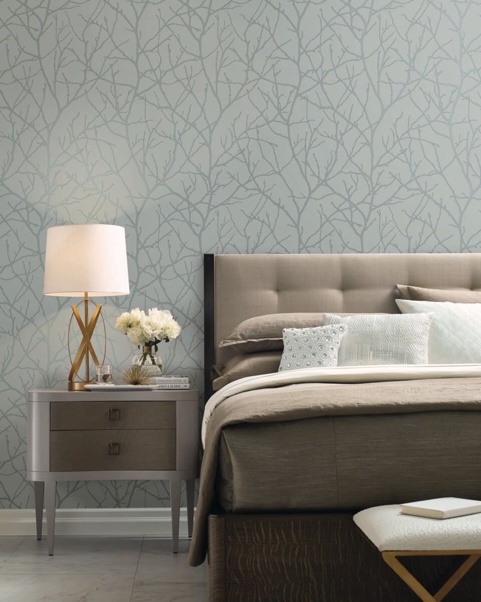The bare branches and twigs of pattern Trees Silhouette captivate and glow with modern metallic, enhancing their inherent natural beauty, shown in smoky blue with silver metallic. This Trees Silhouette Wallpaper measures approximately 20.8 inches wide by 33 feet long, measuring approximately 57.2 square feet per roll. The long awaited follow-up to the popular first release, Modern Metals Second Edition energizes contemporary spaces with charismatic visual artistry defined by the allure of luminous metallic.