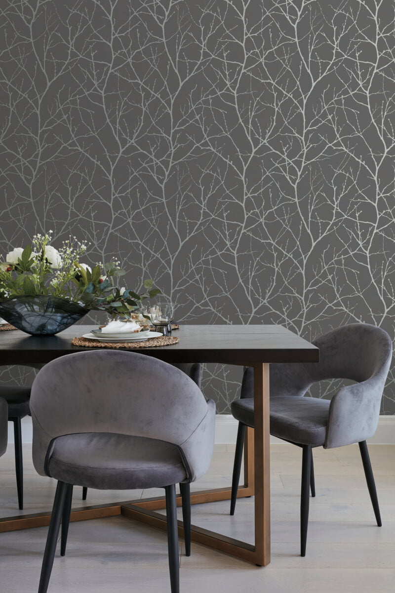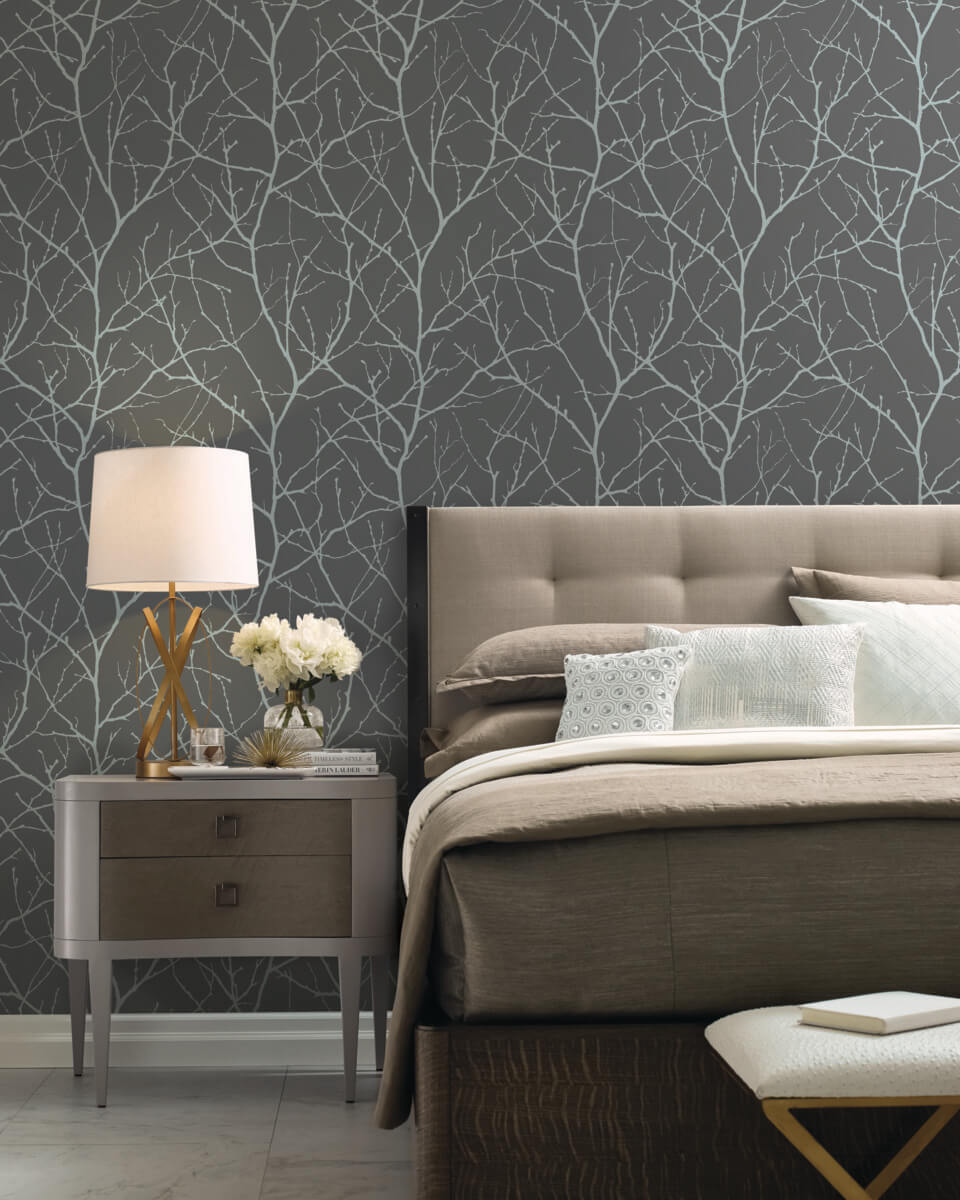 The bare branches and twigs of pattern Trees Silhouette captivate and glow with modern metallic, enhancing their inherent natural beauty, shown in charcoal grey with silver metallic. This Trees Silhouette Wallpaper measures approximately 20.8 inches wide by 33 feet long, measuring approximately 57.2 square feet per roll. The long awaited follow-up to the popular first release, Modern Metals Second Edition energizes contemporary spaces with charismatic visual artistry defined by the allure of luminous metallic.