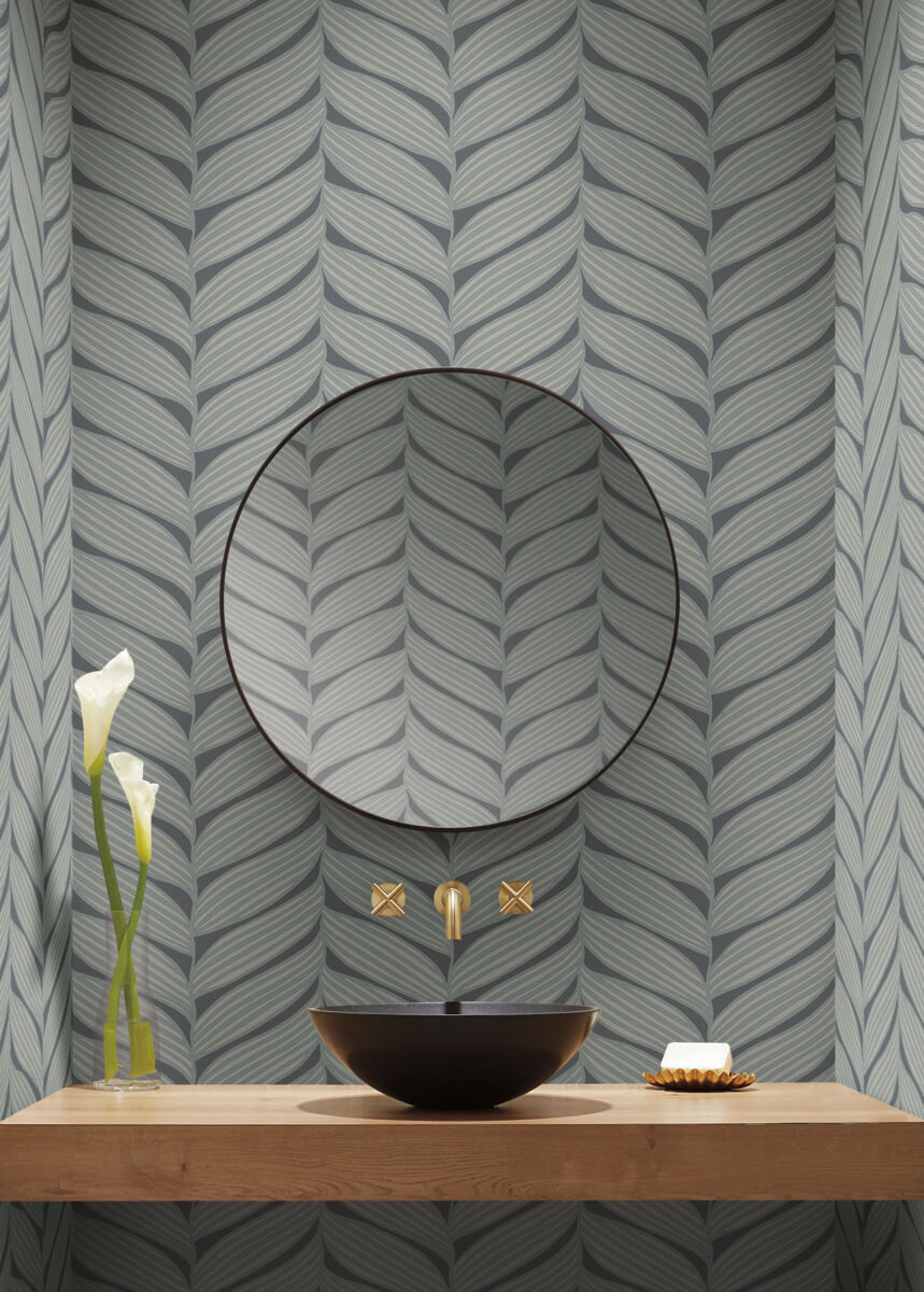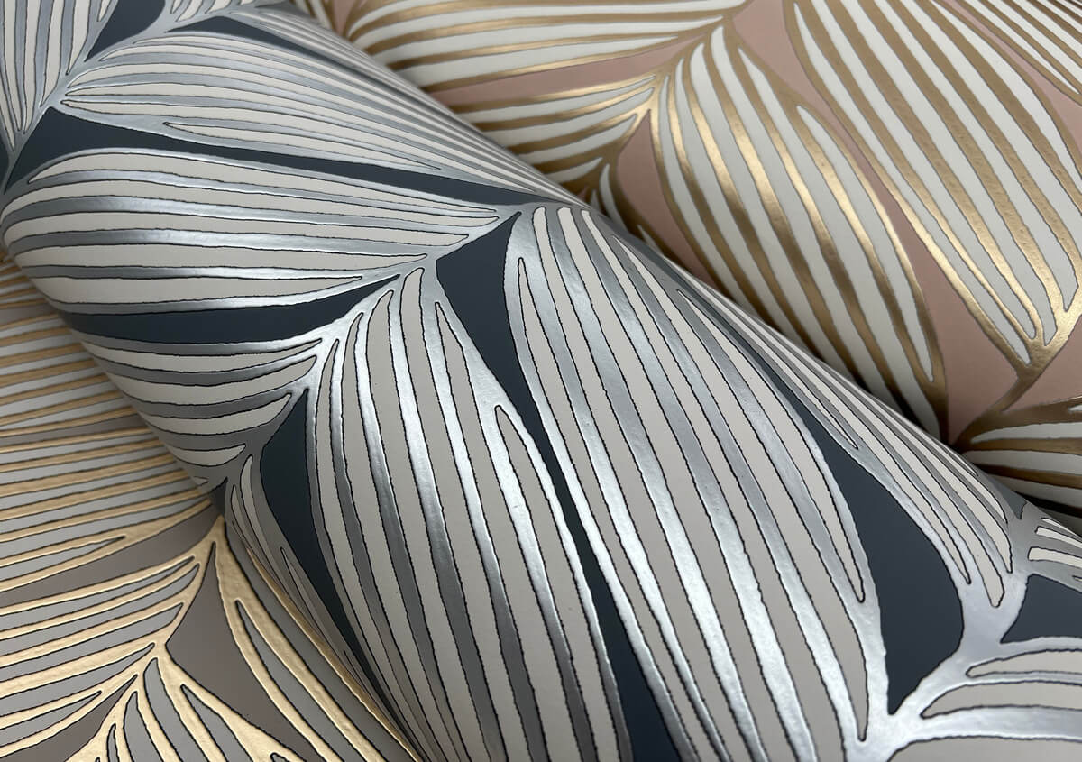 Fronds veined with spectacular metallic define the elegant palms of oversized pattern Luminous Leaves, shown in charcoal grey and nickel metallic. This Luminous Leaves Wallpaper measures approximately 27 inches wide by 26.9 feet long, measuring approximately 60.5 square feet per roll. The long awaited follow-up to the popular first release, Modern Metals Second Edition energizes contemporary spaces with charismatic visual artistry defined by the allure of luminous metallic.