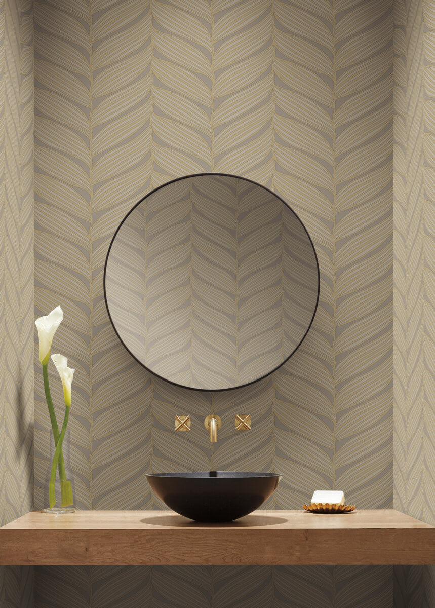 Fronds veined with spectacular metallic define the elegant palms of oversized pattern Luminous Leaves, shown in grey and burnished gold metallic. This Luminous Leaves Wallpaper measures approximately 27 inches wide by 26.9 feet long, measuring approximately 60.5 square feet per roll. The long awaited follow-up to the popular first release, Modern Metals Second Edition energizes contemporary spaces with charismatic visual artistry defined by the allure of luminous metallic.