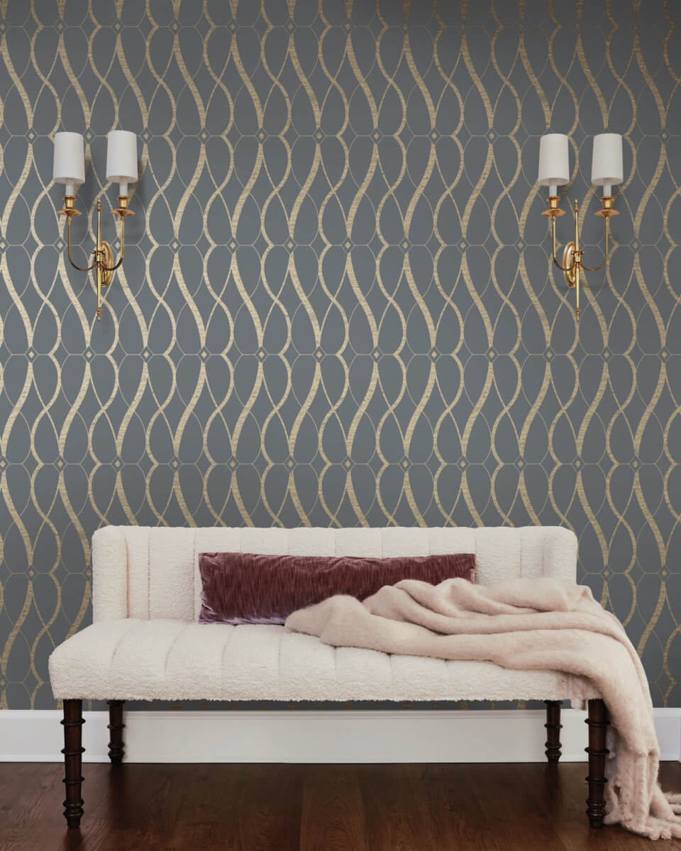 Sinuous recurve lines and diamonds construct a romantic geometric of burnished, weathered metallic in pattern Graceful Geo, shown in smoke grey with gold metallic. This Graceful Geo Wallpaper measures approximately 27 inches wide by 26.9 feet long, measuring approximately 60.5 square feet per roll. The long awaited follow-up to the popular first release, Modern Metals Second Edition energizes contemporary spaces with charismatic visual artistry defined by the allure of luminous metallic.