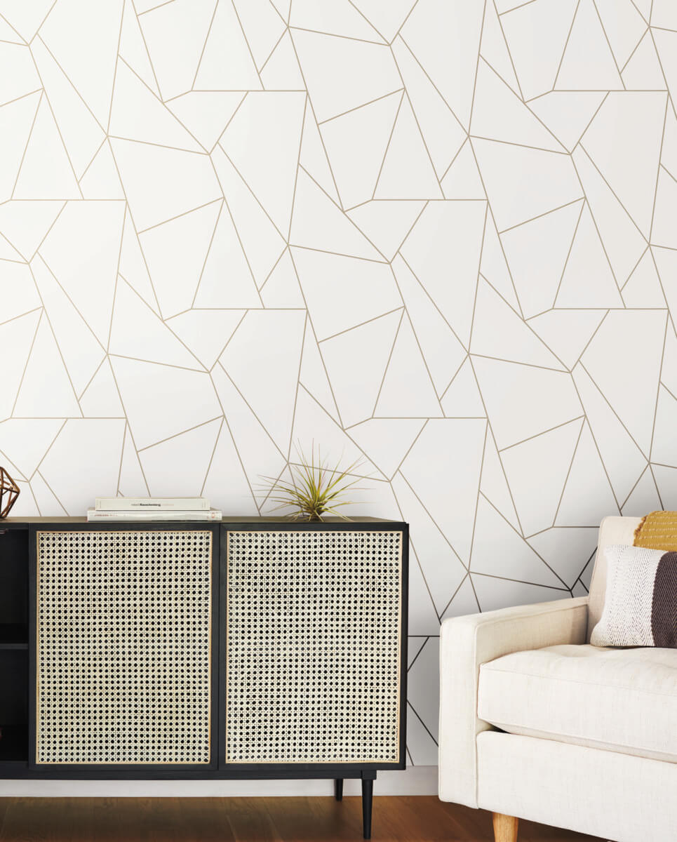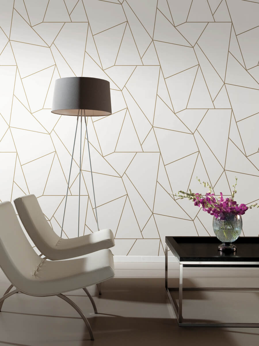 Fractured metallic lines create a contemporary geometric of irregular lines and angles in the Nazca pattern, shown in porcelain white with metallic gold. This Nazca Wallpaper measures approximately 20.8 inches wide by 33 feet long, measuring approximately 57.2 square feet per roll. The long awaited follow-up to the popular first release, Modern Metals Second Edition energizes contemporary spaces with charismatic visual artistry defined by the allure of luminous metallic.