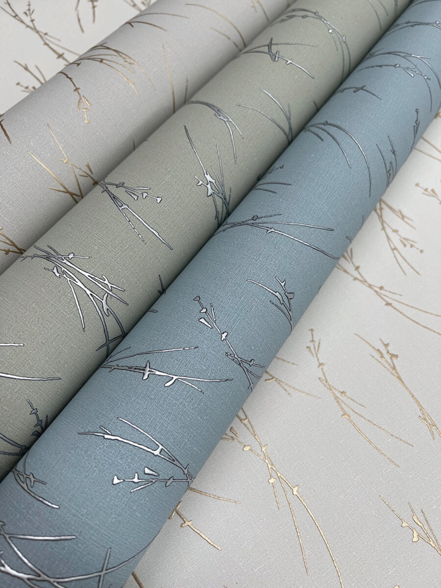 A lively toss of small stems with leaves provides a happy feeling to gentle, open pattern Sprigs, shown in cream and gold metallic. This Sprigs Wallpaper measures approximately 27 inches wide by 26.9 feet long, measuring approximately 60.5 square feet per roll. The long awaited follow-up to the popular first release, Modern Metals Second Edition energizes contemporary spaces with charismatic visual artistry defined by the allure of luminous metallic.