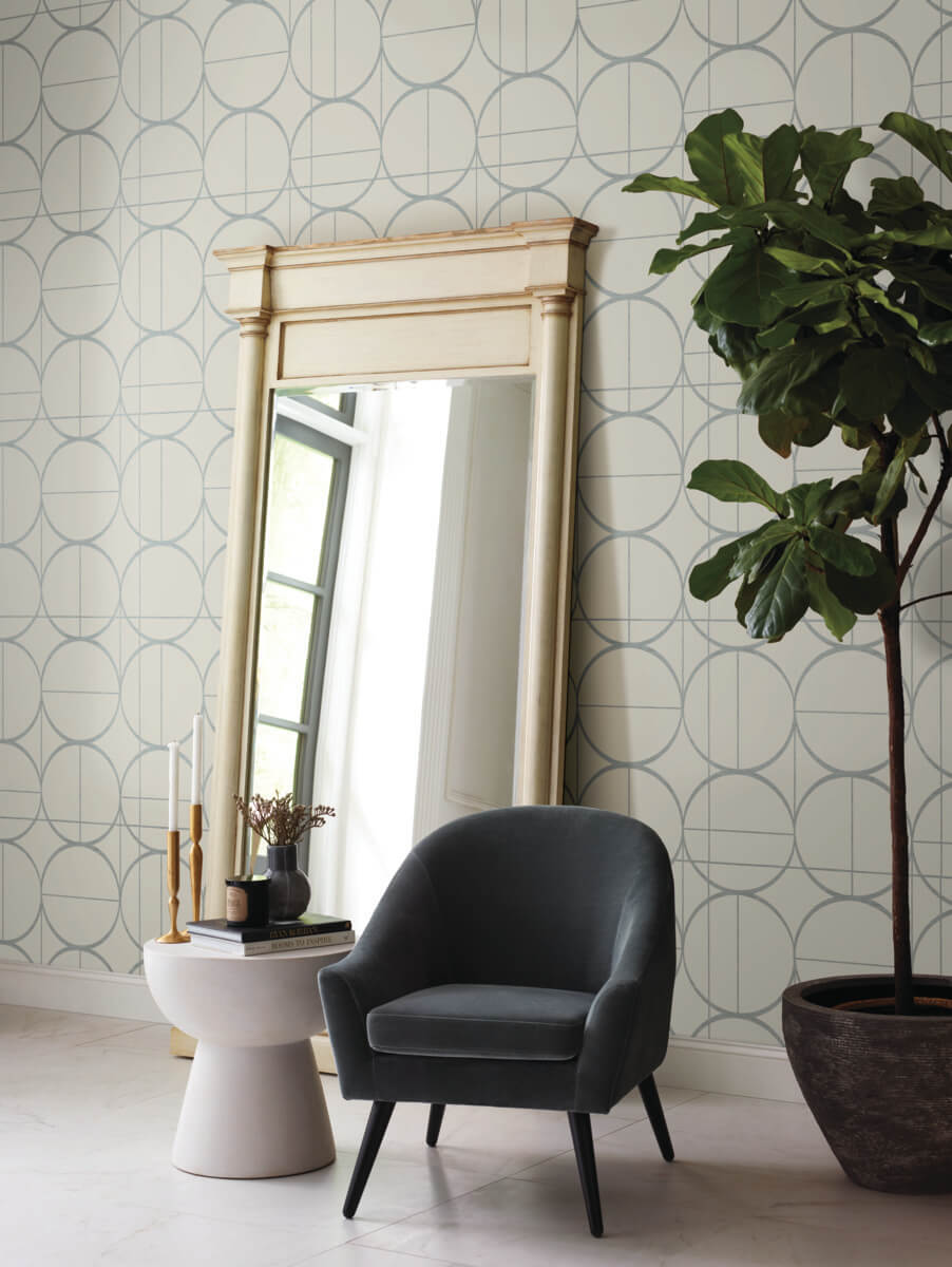 Sun Circle’s perfect geometric form of circles, lines, and grids, when rendered in metallic, recall the streamlined elegance of the Art Deco style, shown in taupe with pewter metallic. This Sun Circles Wallpaper measures approximately 27 inches wide by 26.9 feet long, measuring approximately 60.5 square feet per roll. The long awaited follow-up to the popular first release, Modern Metals Second Edition energizes contemporary spaces with charismatic visual artistry defined by the allure of luminous metallic.