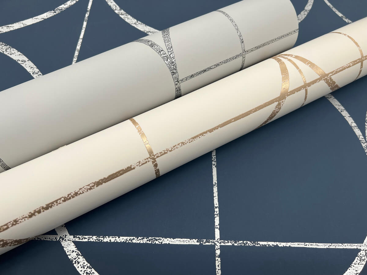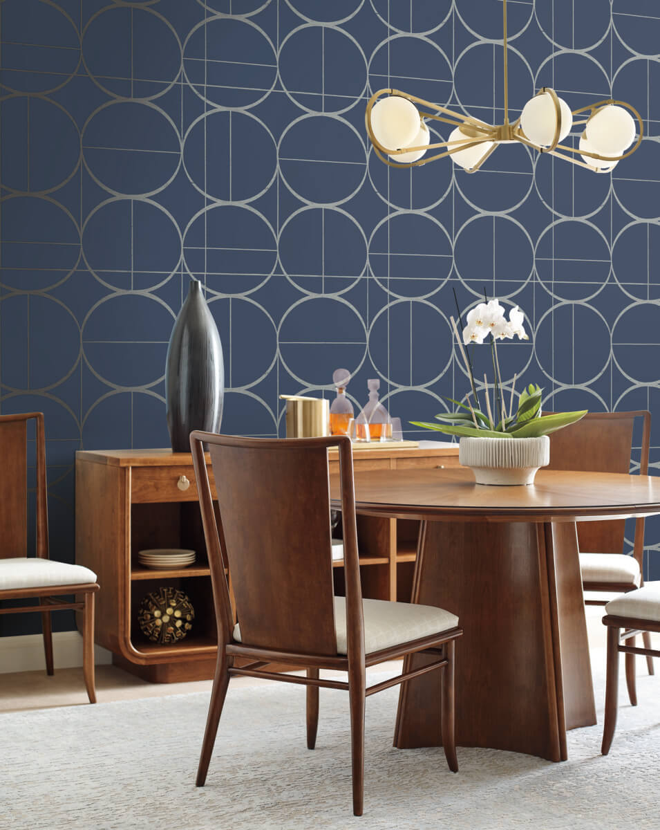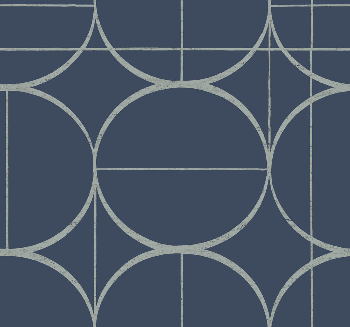 Sun Circle’s perfect geometric form of circles, lines, and grids, when rendered in metallic, recall the streamlined elegance of the Art Deco style, shown in cobalt blue with silver metallic. This Sun Circles Wallpaper measures approximately 27 inches wide by 26.9 feet long, measuring approximately 60.5 square feet per roll. The long awaited follow-up to the popular first release, Modern Metals Second Edition energizes contemporary spaces with charismatic visual artistry defined by the allure of luminous metallic.