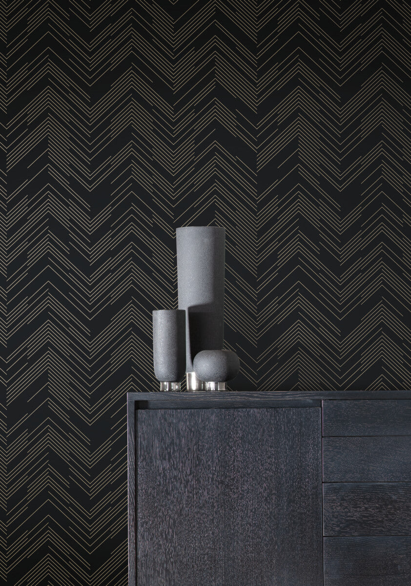 The suggestion of a geometric metallic pattern, Polished Chevron provides an unexpected break from the conformity of style, shown in ink black with gold metallic. This Polished Chevron Wallpaper measures approximately 27 inches wide by 26.9 feet long, measuring approximately 60.5 square feet per roll. The long awaited follow-up to the popular first release, Modern Metals Second Edition energizes contemporary spaces with charismatic visual artistry defined by the allure of luminous metallic.