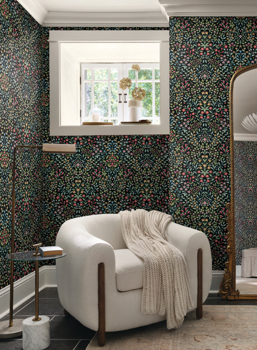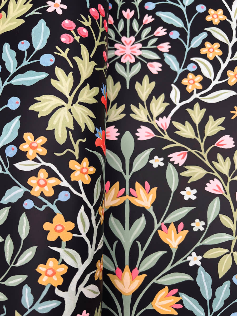 Wildflowers bloom amid vines lined with berries and foliage, putting nature on display in playful, curved waves. Featuring a vibrant palette of pinks, yellows, greens, and blues against black. This Garden Terrace Wallpaper measures approximately 27 inches wide by 27 feet long, measuring approximately 60.8 square feet per roll. This collection of timeless wallcoverings is layered with warmth and charm, and effortlessly blends nostalgic patterns with modern designs. This assortment has a little bit of everything—simple stripes, subtle plaids, vintage motifs, and bold florals.