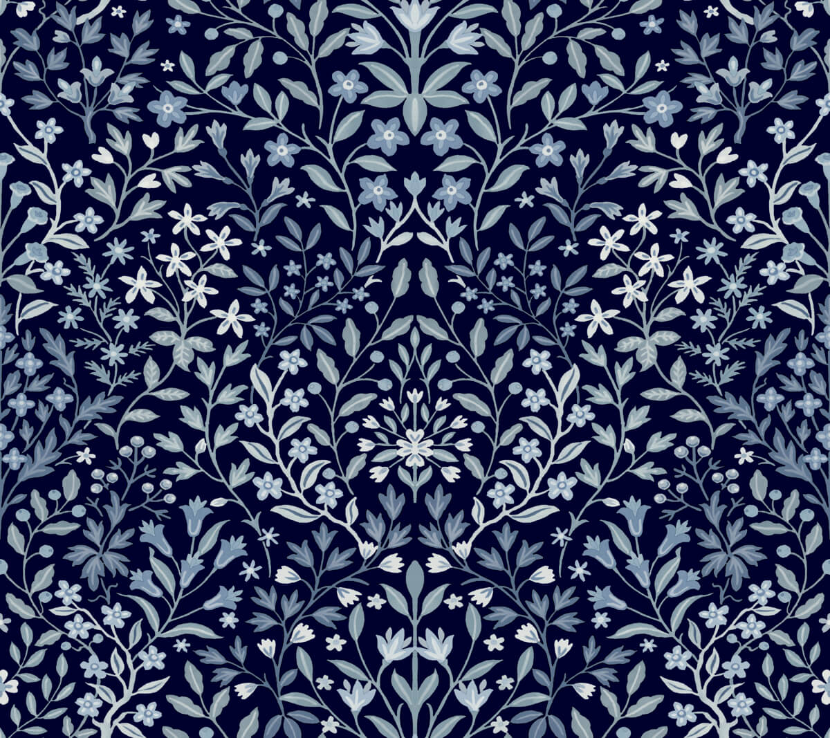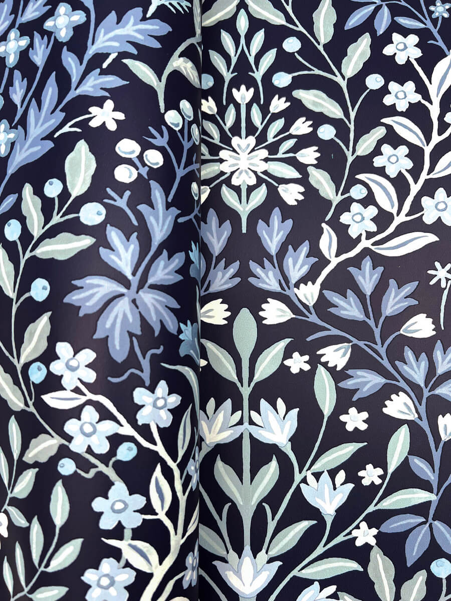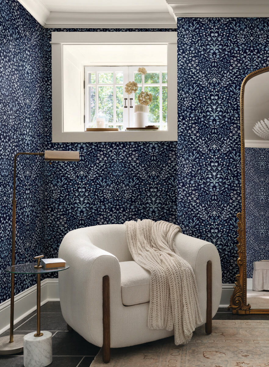 Wildflowers bloom amid vines lined with berries and foliage, putting nature on display in playful, curved waves. Featuring a palette of rich, monochromatic blues. This Garden Terrace Wallpaper measures approximately 27 inches wide by 27 feet long, measuring approximately 60.8 square feet per roll. This collection of timeless wallcoverings is layered with warmth and charm, and effortlessly blends nostalgic patterns with modern designs. This assortment has a little bit of everything—simple stripes, subtle plaids, vintage motifs, and bold florals.