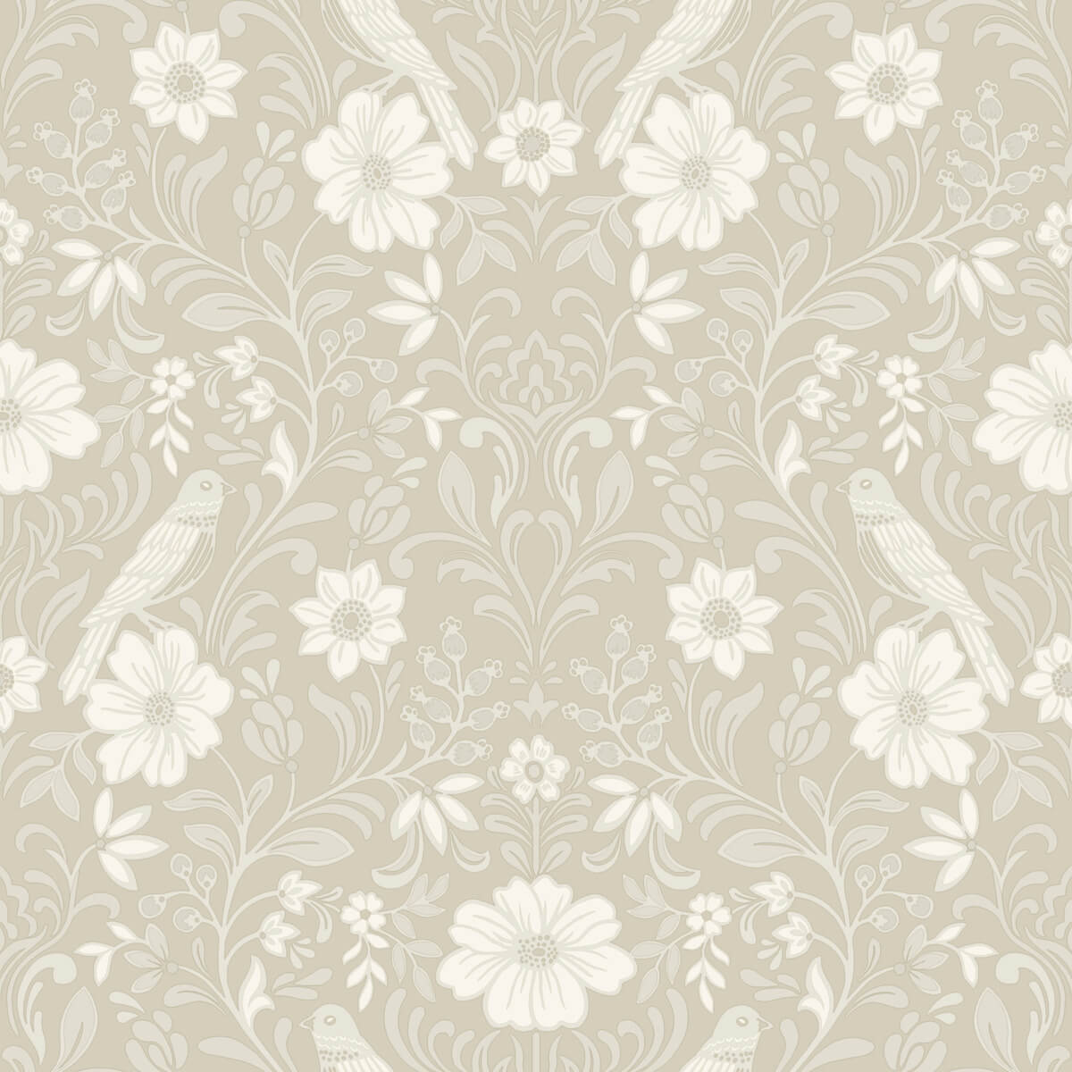 Sparrows perch on flourishing blooms amid rich vines and ripe berries in this delightful woodland damask wallpaper. Featuring white and pale grey detailing against a taupe backdrop. This Colette Wallpaper measures approximately 20.5 inches wide by 33 feet long, measuring approximately 56.4 square feet per roll. This collection of timeless wallcoverings is layered with warmth and charm, and effortlessly blends nostalgic patterns with modern designs. This assortment has a little bit of everything—simple stripes, subtle plaids, vintage motifs, and bold florals.