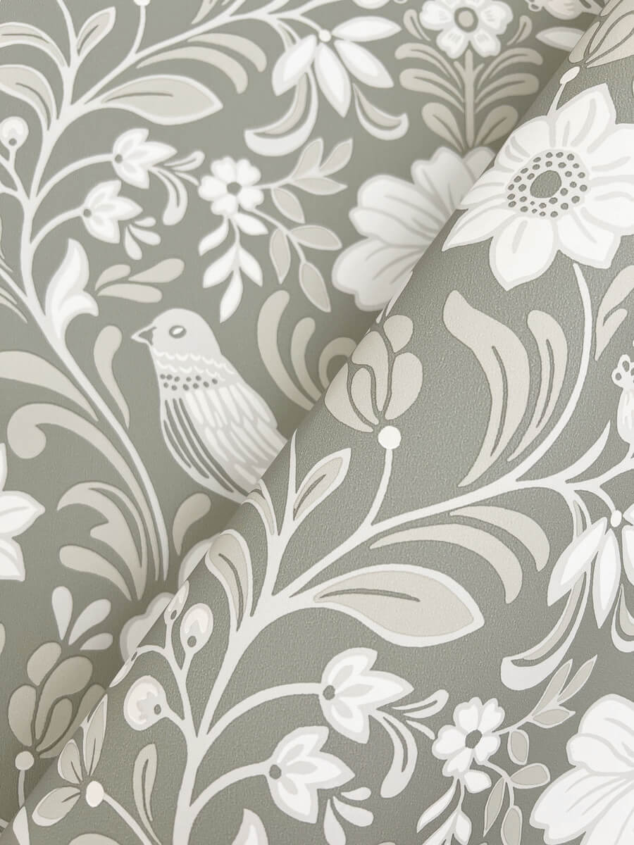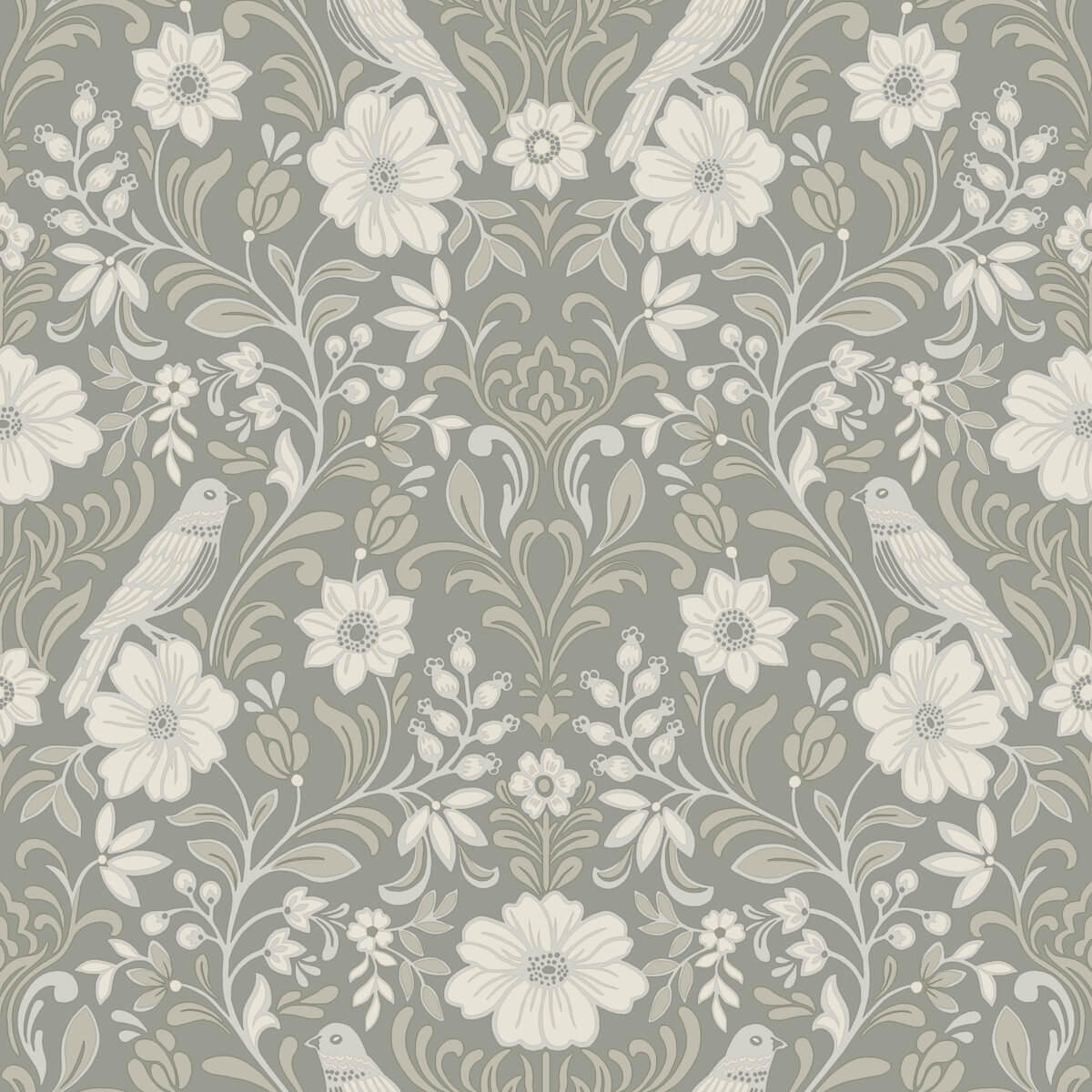 Sparrows perch on flourishing blooms amid rich vines and ripe berries in this delightful woodland damask wallpaper. Featuring white and neutral detailing against a grey backdrop. This Colette Wallpaper measures approximately 20.5 inches wide by 33 feet long, measuring approximately 56.4 square feet per roll. This collection of timeless wallcoverings is layered with warmth and charm, and effortlessly blends nostalgic patterns with modern designs. This assortment has a little bit of everything—simple stripes, subtle plaids, vintage motifs, and bold florals.