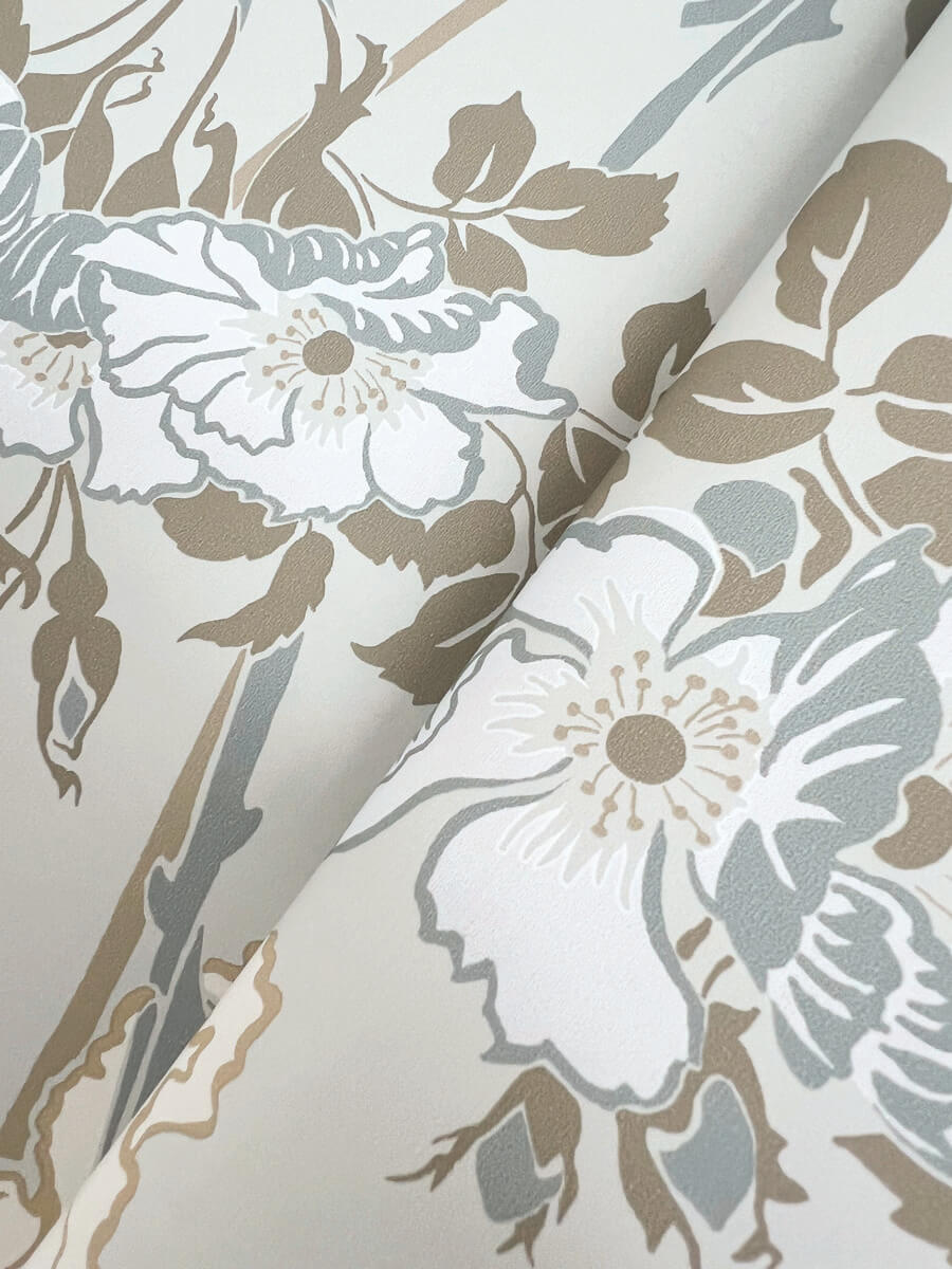 Classic floral motifs gently intertwine with a delicate array of leafy vines. A palette of moss, evergreen, brown, cream, and light blue brings cool sophistication to the design. This Gwendolyn Wallpaper measures approximately 20.5 inches wide by 33 feet long, measuring approximately 56.4 square feet per roll. This collection of timeless wallcoverings is layered with warmth and charm, and effortlessly blends nostalgic patterns with modern designs. This assortment has a little bit of everything—simple stripes, subtle plaids, vintage motifs, and bold florals.