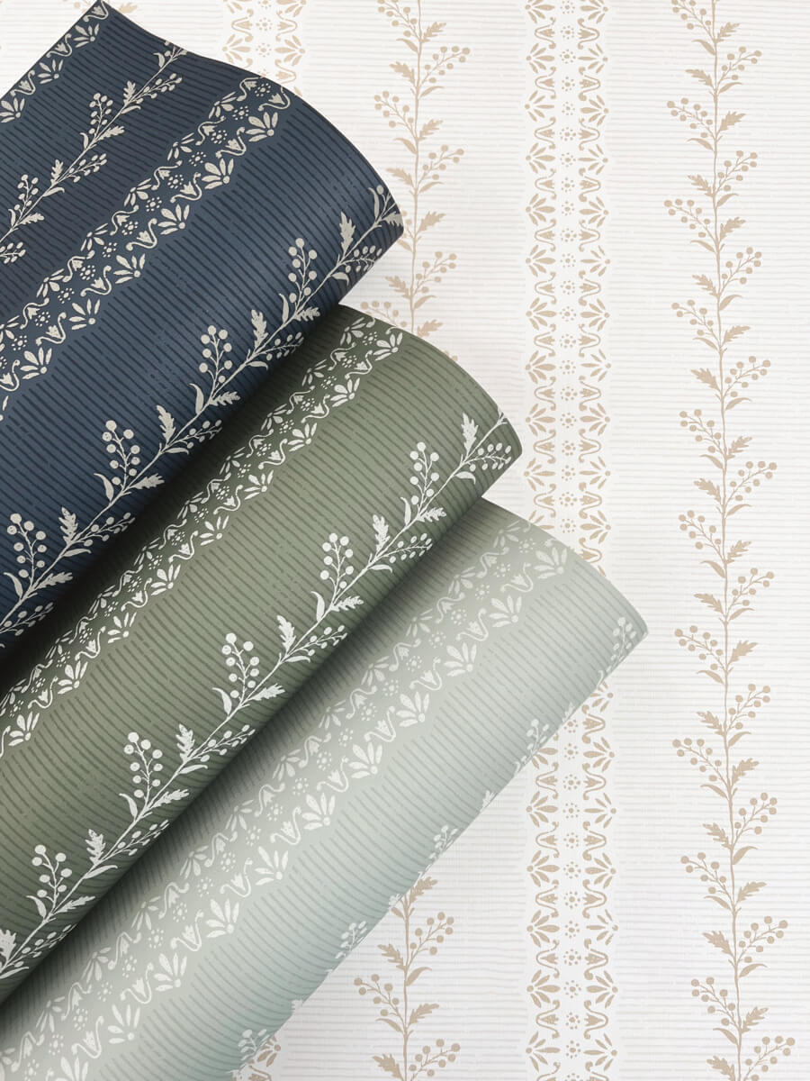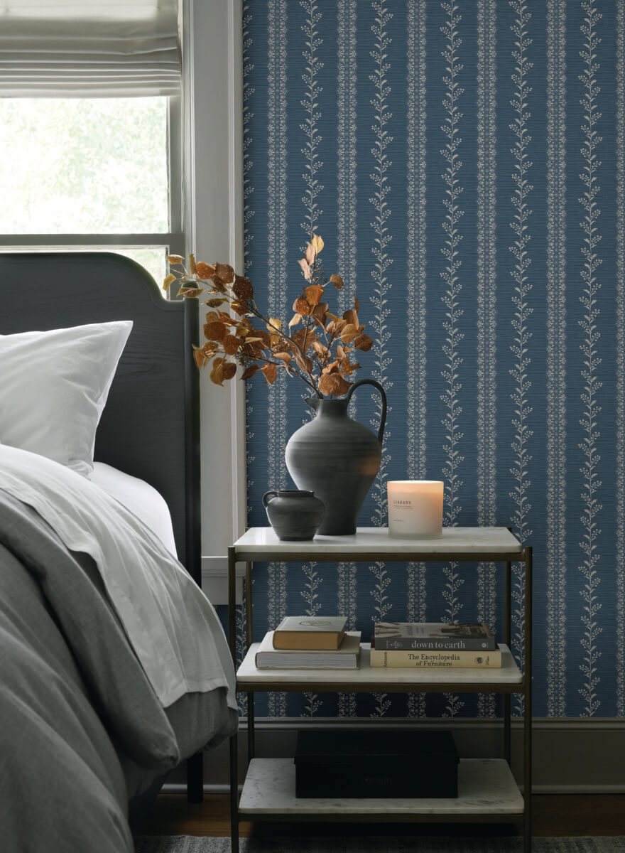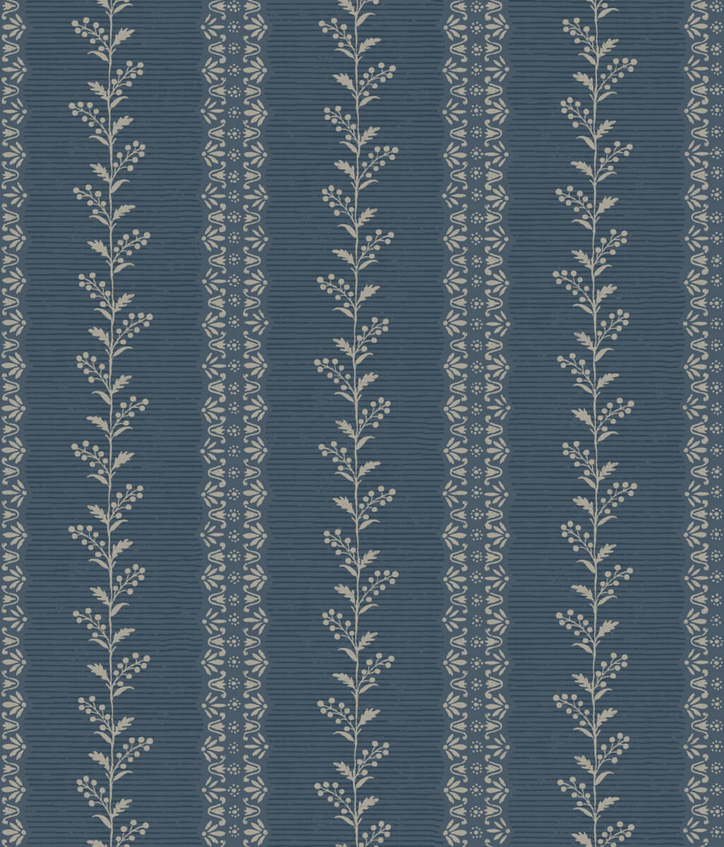 An elevated striped design with nods to nature. Wide columns of delicately lined detailing are overlaid with climbing, berry-laden vines and floral stamps for a scalloped interlude. Featuring a simple palette of dark blue and cream. This Everleigh Wallpaper measures approximately 20.5 inches wide by 33 feet long, measuring approximately 56.4 square feet per roll. This collection of timeless wallcoverings is layered with warmth and charm, and effortlessly blends nostalgic patterns with modern designs. This assortment has a little bit of everything—simple stripes, subtle plaids, vintage motifs, and bold florals.