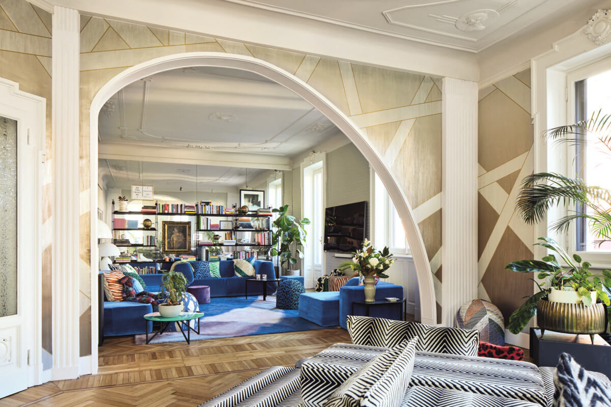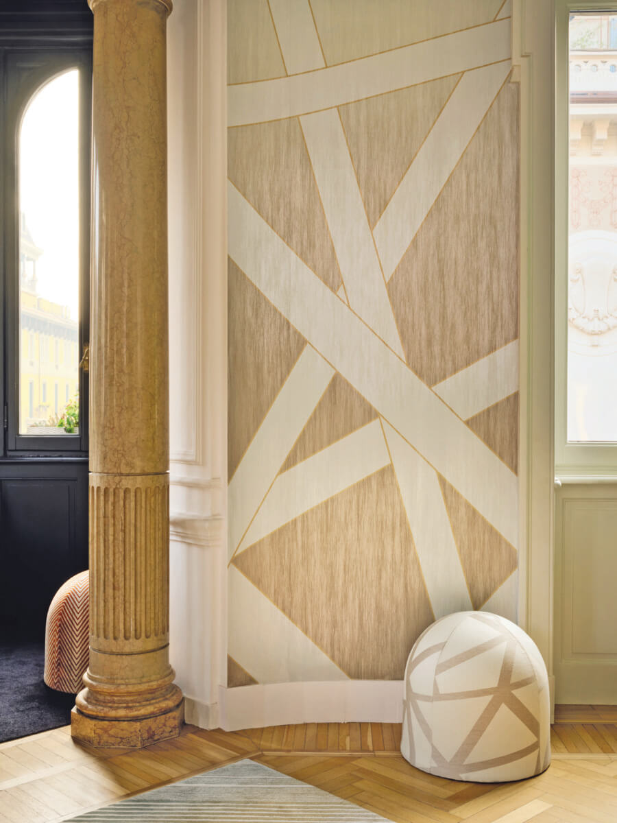 Dimensional layers of angular stripes are embellished with silken textures and metallic flair in the dramatically scaled mural Nastri Shade. Seen here in warm beige, cool white, and gold on a silvered field. This Nastri Shade Mural measures approximately 35.4 inches wide by 10.5 feet long, measuring approximately 31 square feet per roll. The passion for decoration is the point of contact between the two realities: an intense and profitable, passionate and spontaneous creative comparison where the emotion of the chromatic elements is intertwined with research into innovative materials and printing techniques. The Missoni Wallcoverings 05 wallpaper collection was born from this vision: an innovative proposal, which harmonizes shades, geometries and nature, in a kaleidoscope of designs, materials and colors interpreted with a technique with a strong innovative value.