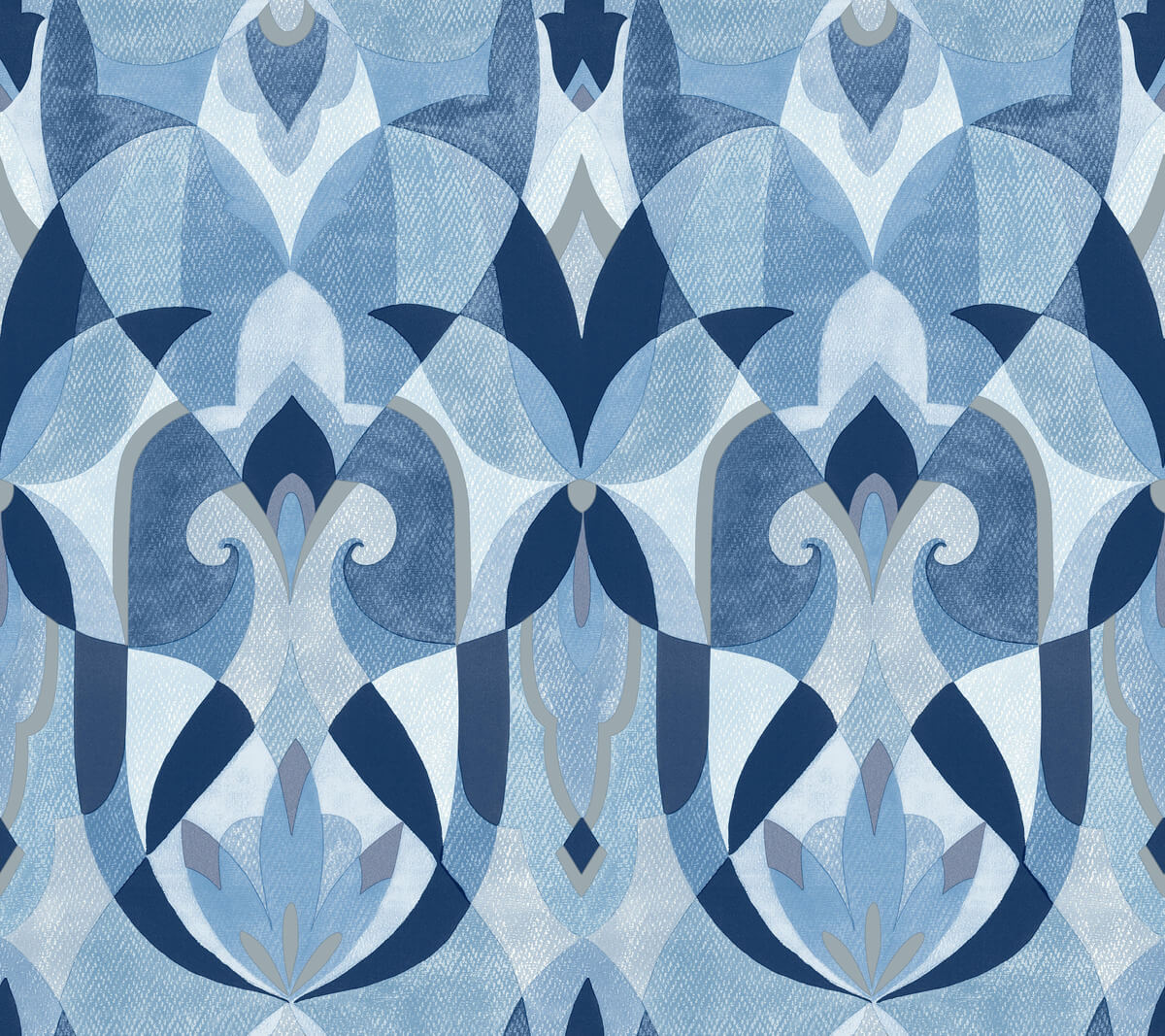 A colorful stylized stained-glass pattern tells the story of Mediterranean beauty and light in pattern Malta. Sand and sea, terracotta arches, and olive groves characterize a perfect paradise of light and luxury captured along the windswept coastlines of the Mediterranean.