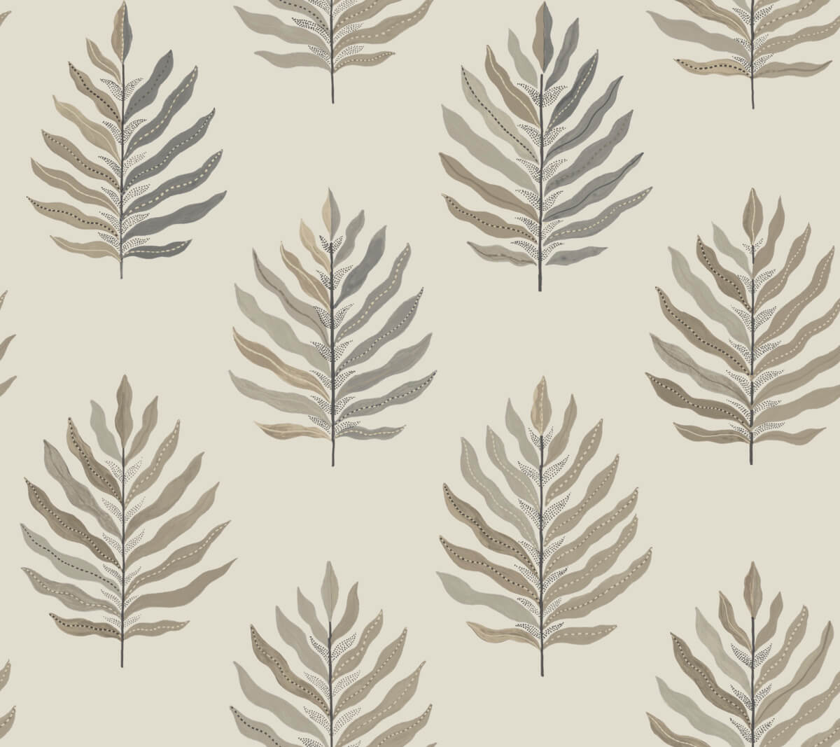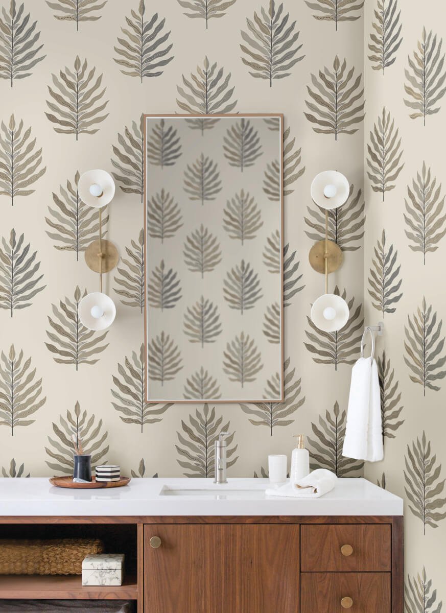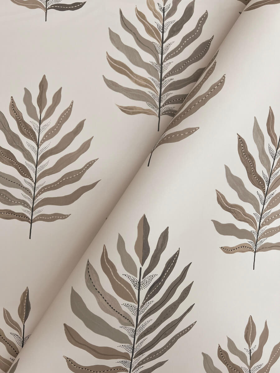 Breezy palm leaves feature a chic, split palette in design Miramar. Seen here with taupe and grey paired against charcoal. This Miramar Wallpaper measures approximately 27 inches wide by 27 feet long, measuring approximately 60.8 square feet per roll. California’s scenic vistas and luxurious, laid-back lifestyle inspires this sun-drenched collection of organic textures and breezy botanical designs.