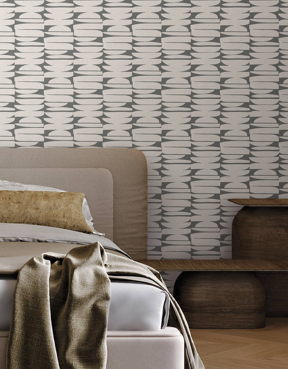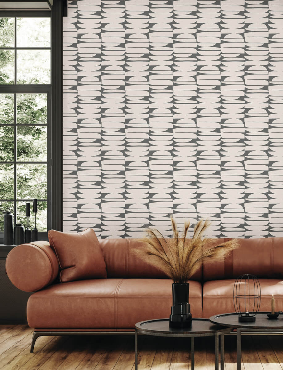 Lovely Libra's stacked shapes offer a perfect balance between geometric and stripes. The charcoal background is decorated with ovoid forms inked in sandy beige with textural detailing. This Lovely Libra Wallpaper measures approximately 27 inches wide by 27 feet long, measuring approximately 60.8 square feet per roll. California’s scenic vistas and luxurious, laid-back lifestyle inspires this sun-drenched collection of organic textures and breezy botanical designs.