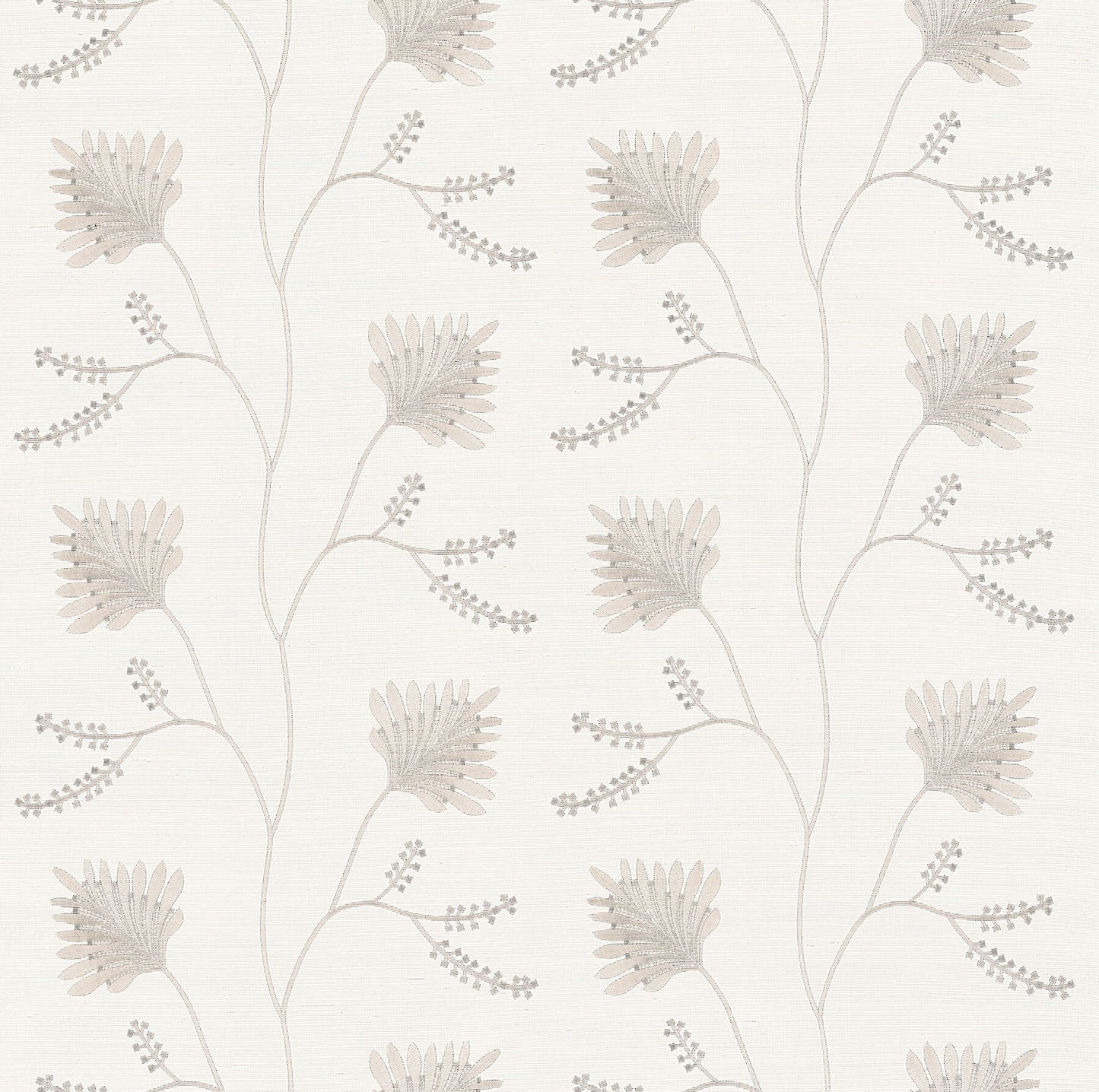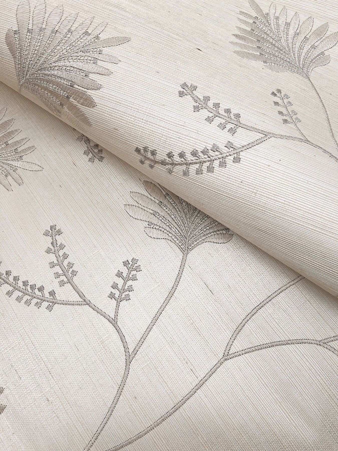 Pattern Laelynn spares no luxury; trailing botanical columns are embroidered using metallic threads along a sisal ground. Seen here with silver and streel grey threads against cream sisal. This Laelynn Wallpaper measures approximately 36 inches wide by 24 feet long, measuring approximately 72 square feet per roll. Traditional and timeless meets modern refinement, with artfully crafted designs redefined in striking color palettes.