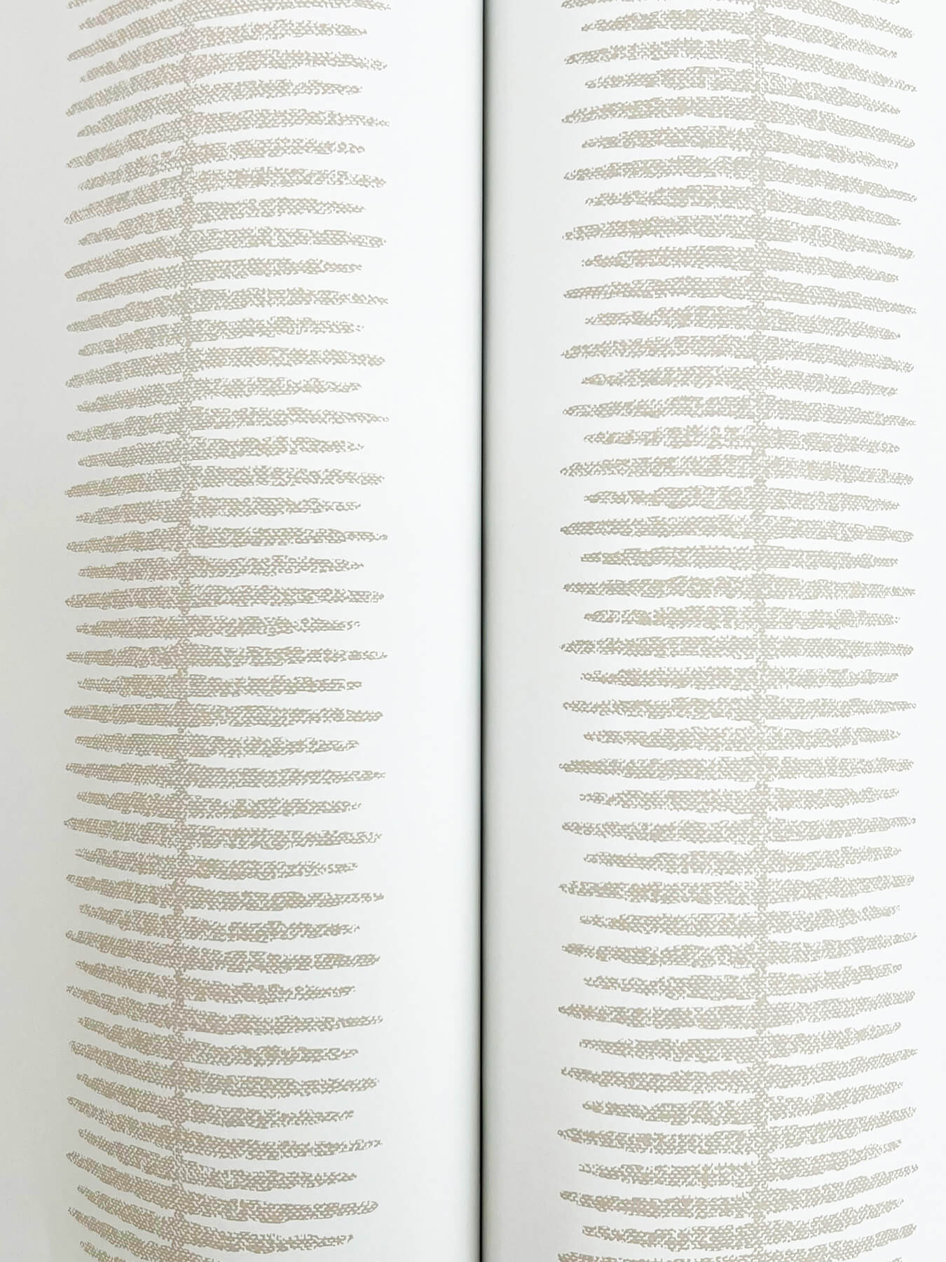Wide, feathered columns alternate with metallic pinstripes in Tanden Stripe's high-contrast rejuvenation of the classic pattern. Seen here in taupe, cream, and polished silver. This Tandem Stripe Wallpaper measures approximately 27 inches wide by 27 feet long, measuring approximately 60.8 square feet per roll. Traditional and timeless meets modern refinement, with artfully crafted designs redefined in striking color palettes.