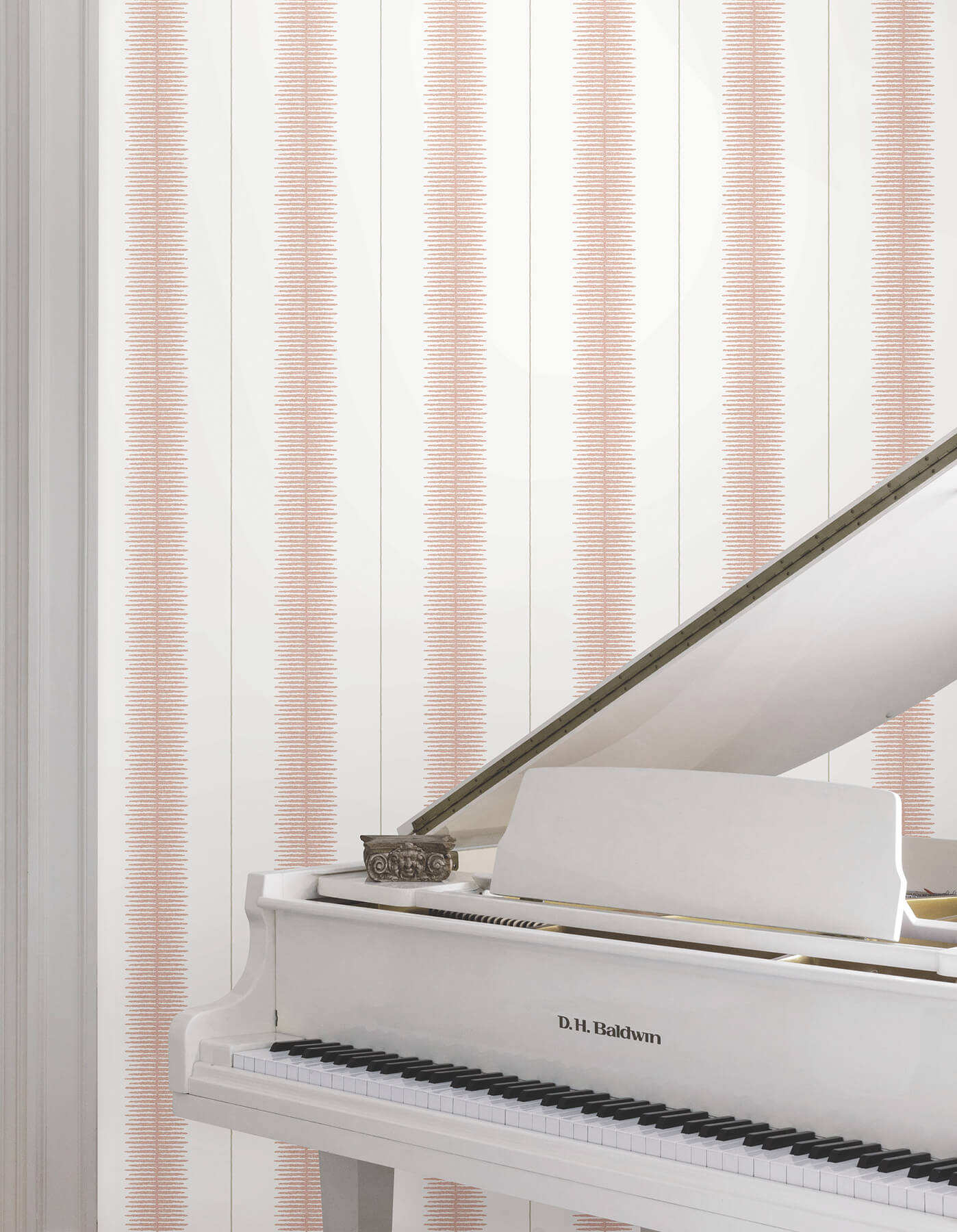 Wide, feathered columns alternate with metallic pinstripes in Tanden Stripe's high-contrast rejuvenation of the classic pattern. Seen here in brick, cream, and pale gold. This Tandem Stripe Wallpaper measures approximately 27 inches wide by 27 feet long, measuring approximately 60.8 square feet per roll. Traditional and timeless meets modern refinement, with artfully crafted designs redefined in striking color palettes.