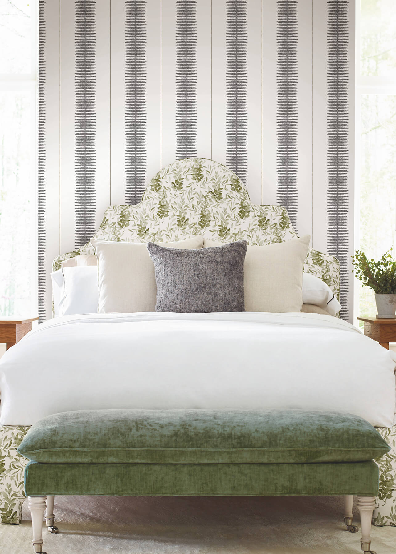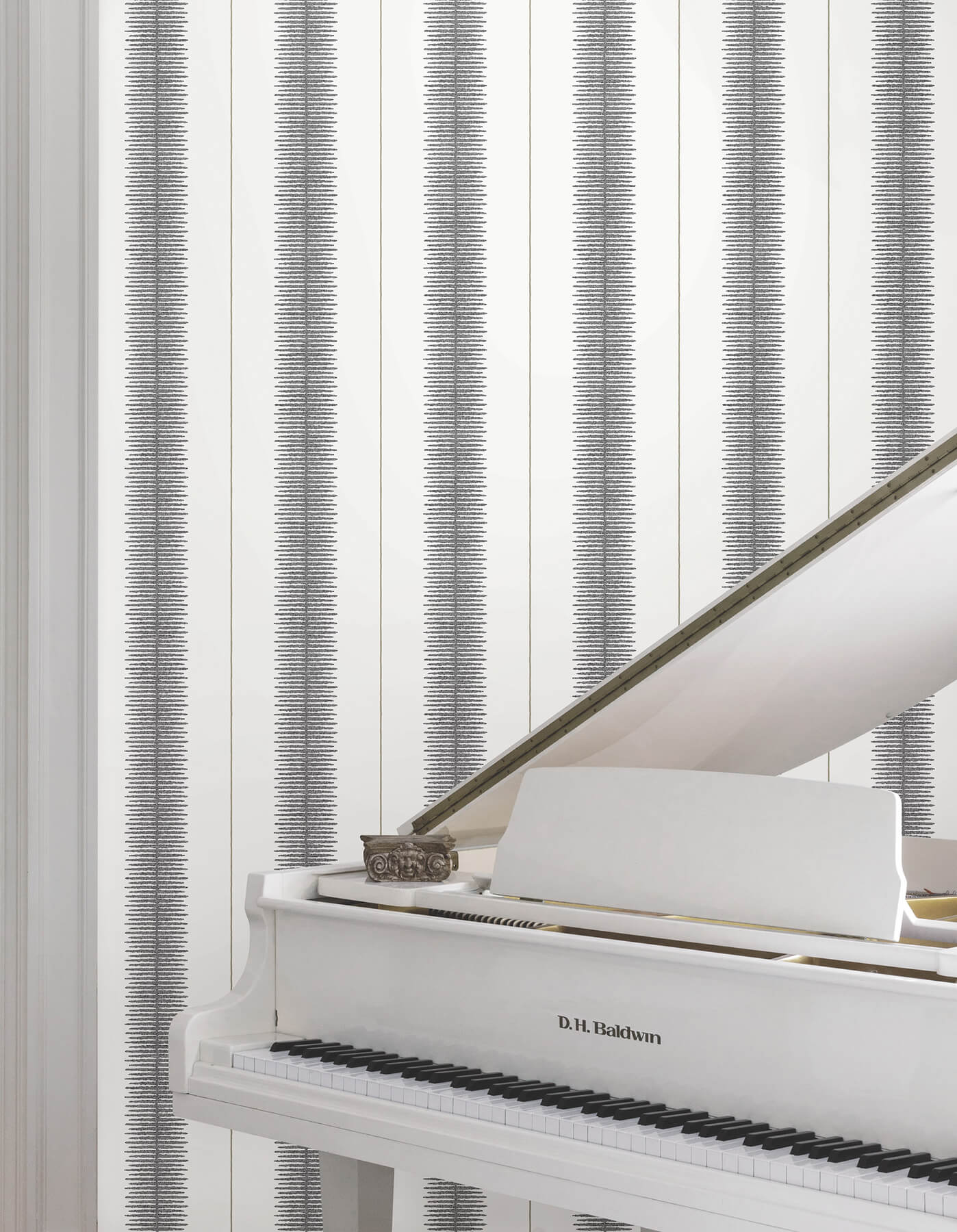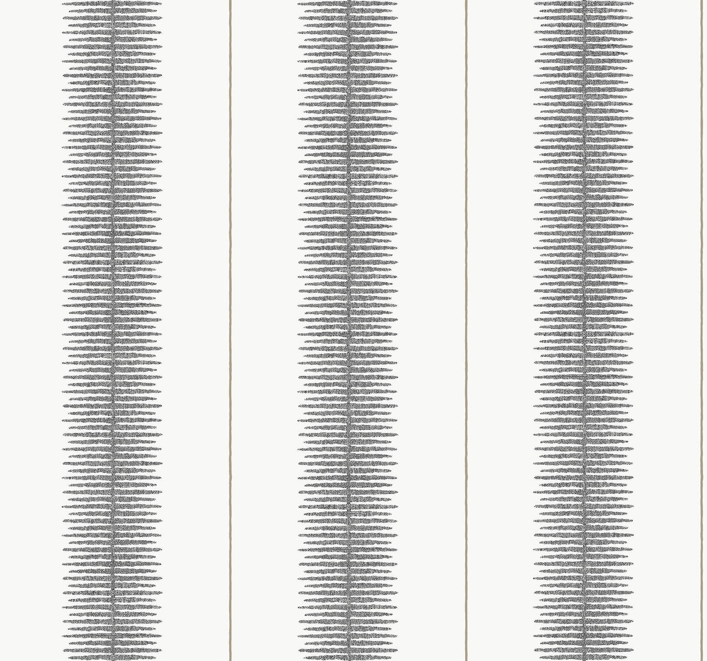 Wide, feathered columns alternate with metallic pinstripes in Tanden Stripe's high-contrast rejuvenation of the classic pattern. Seen here in black, cream, and sterling. This Tandem Stripe Wallpaper measures approximately 27 inches wide by 27 feet long, measuring approximately 60.8 square feet per roll. Traditional and timeless meets modern refinement, with artfully crafted designs redefined in striking color palettes.