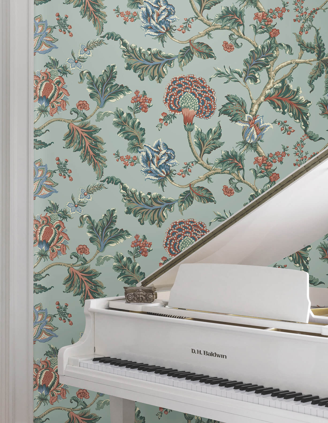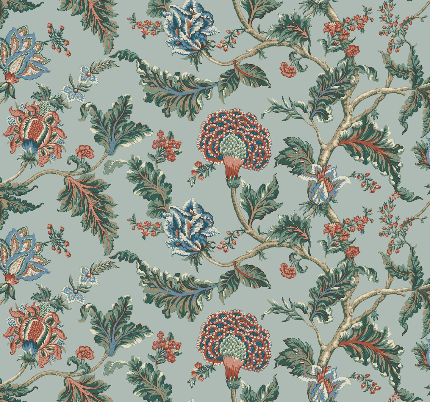 Opulent leaves and lush, multi-layered flowers decorate winding branches in Monroe's impressively scaled Jacobean design. Seen here in a palette of robin's egg, salmon, powder blue, teal, sea green, cream, and golden taupe. This Monroe Wallpaper measures approximately 54 inches wide by 27 feet long, measuring approximately 121.5 square feet per roll. Traditional and timeless meets modern refinement, with artfully crafted designs redefined in striking color palettes.