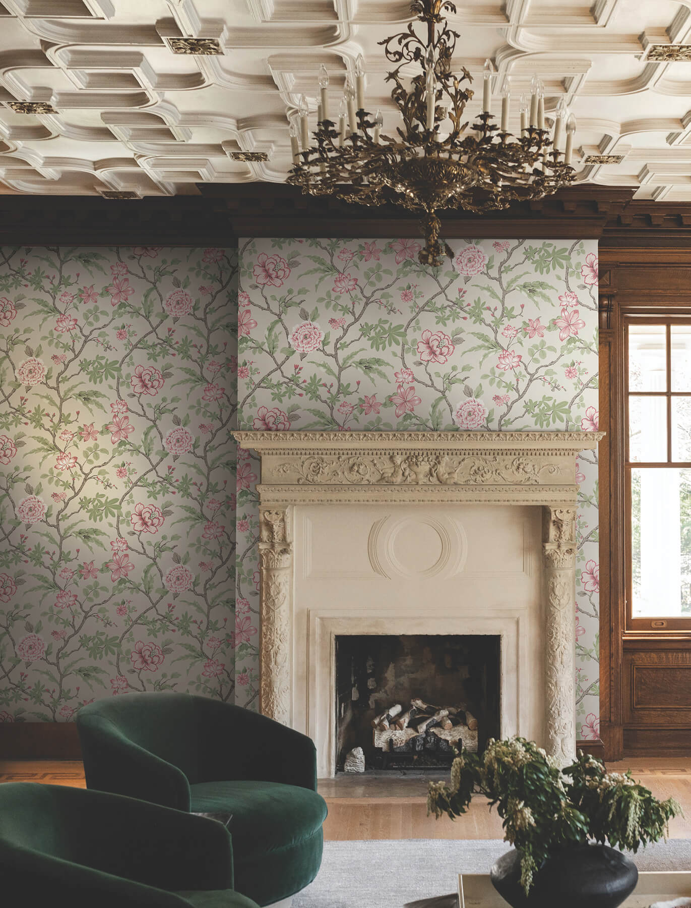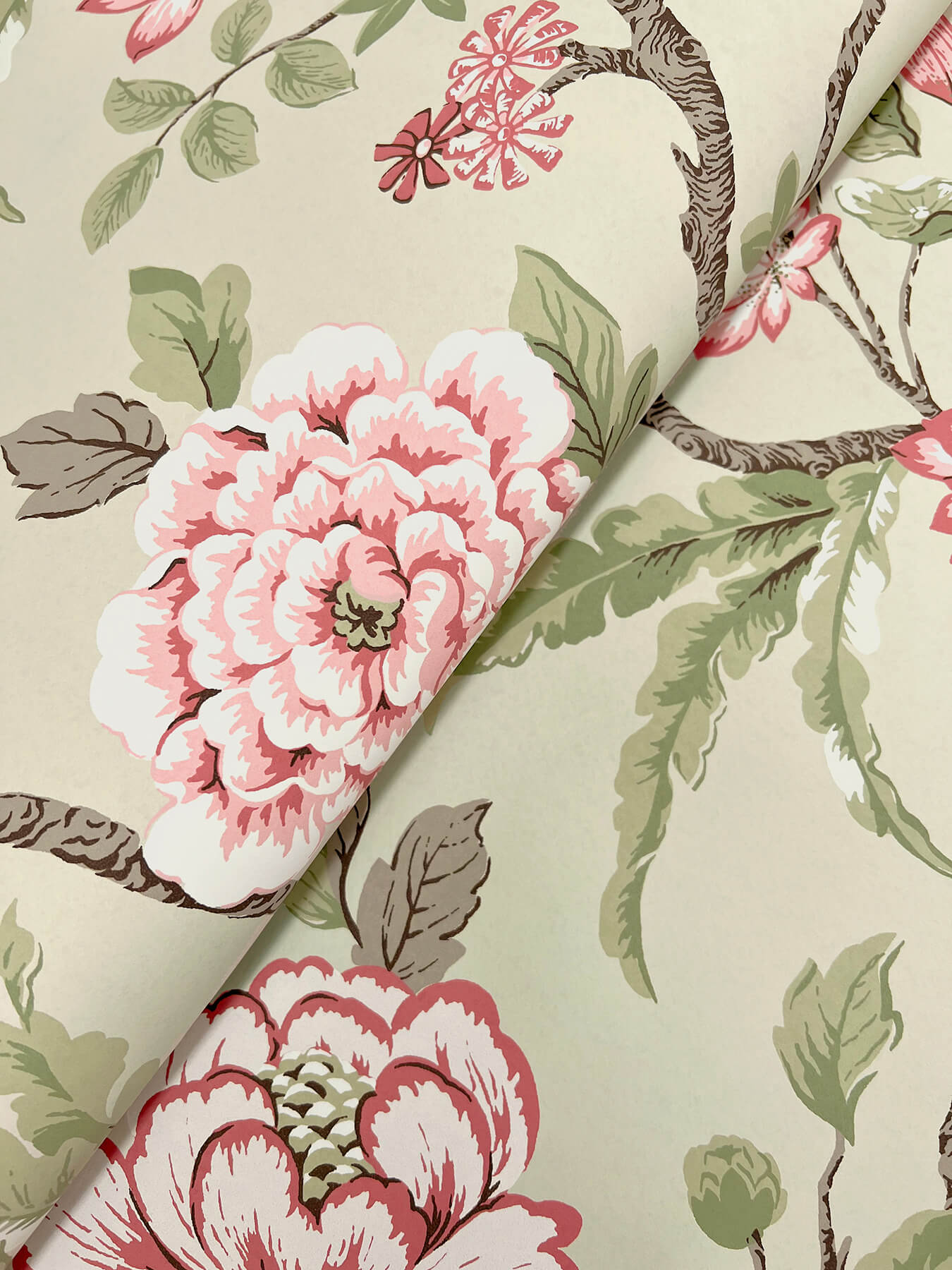 Twisting branches sport a diverse array of lush leaves and voluminous blooms in stately Courtyard Botanical. Featured here in a palette of powder pink, raspberry, sage, moss, cream, beige, and taupe. This Courtyard Botanical Wallpaper measures approximately 27 inches wide by 27 feet long, measuring approximately 60.8 square feet per roll. Traditional and timeless meets modern refinement, with artfully crafted designs redefined in striking color palettes.