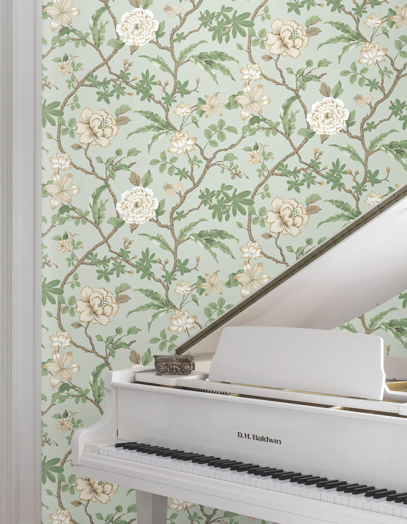 Twisting branches sport a diverse array of lush leaves and voluminous blooms in stately Courtyard Botanical. Featured here in a palette of golden taupe, cream, sage, moss, powder blue, beige, and brown. This Courtyard Botanical Wallpaper measures approximately 27 inches wide by 27 feet long, measuring approximately 60.8 square feet per roll. Traditional and timeless meets modern refinement, with artfully crafted designs redefined in striking color palettes.