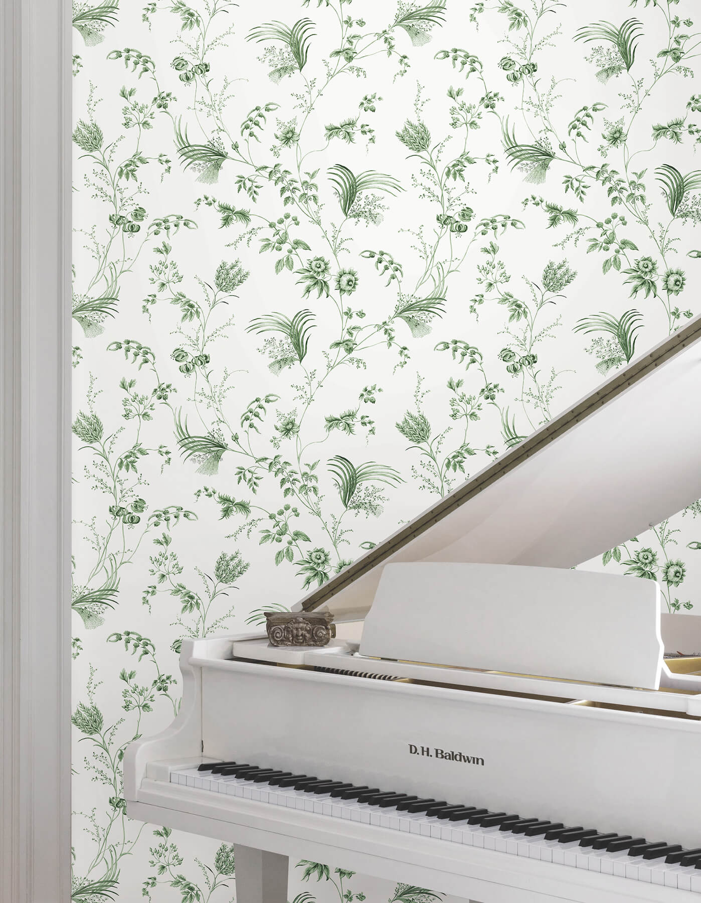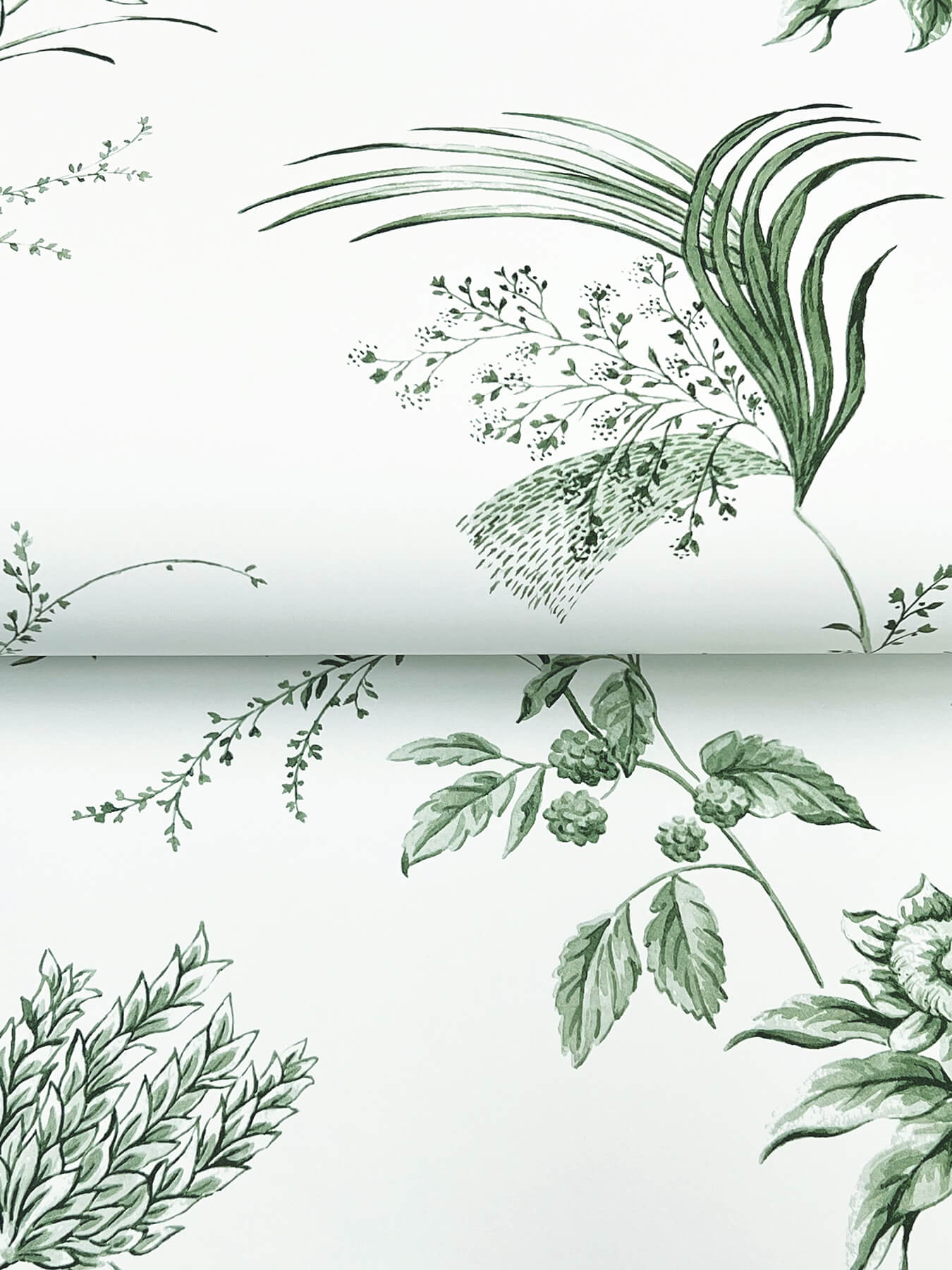 Wildflowers intertwine with prairie grasses in airy and elegant design Floral Lace. Seen here inked in green against white. This Floral Lace Wallpaper measures approximately 27 inches wide by 27 feet long, measuring approximately 60.8 square feet per roll. Traditional and timeless meets modern refinement, with artfully crafted designs redefined in striking color palettes.