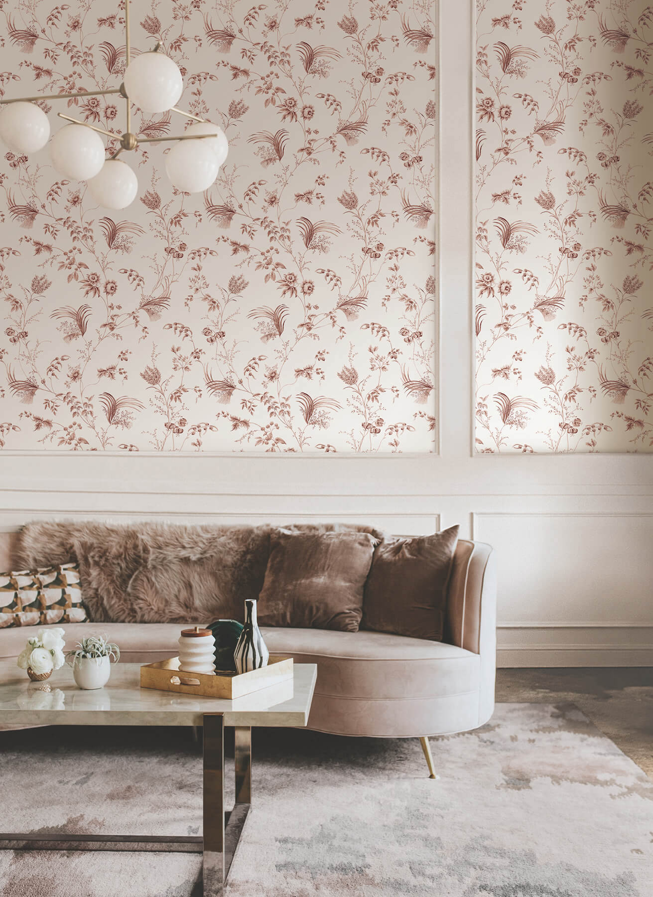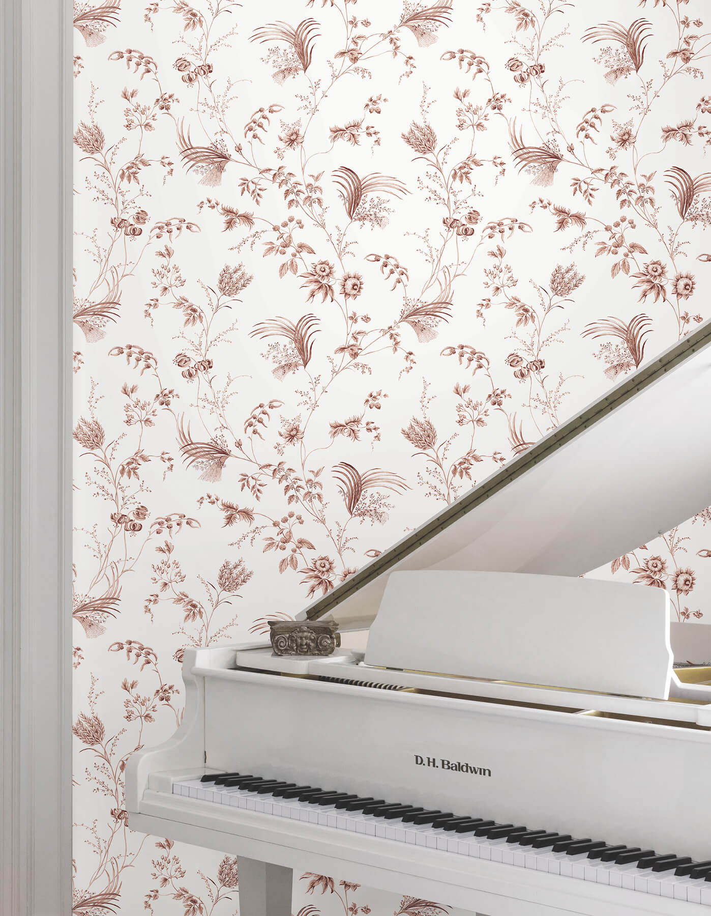 Wildflowers intertwine with prairie grasses in airy and elegant design Floral Lace. Seen here inked in brick red against white. This Floral Lace Wallpaper measures approximately 27 inches wide by 27 feet long, measuring approximately 60.8 square feet per roll. Traditional and timeless meets modern refinement, with artfully crafted designs redefined in striking color palettes.